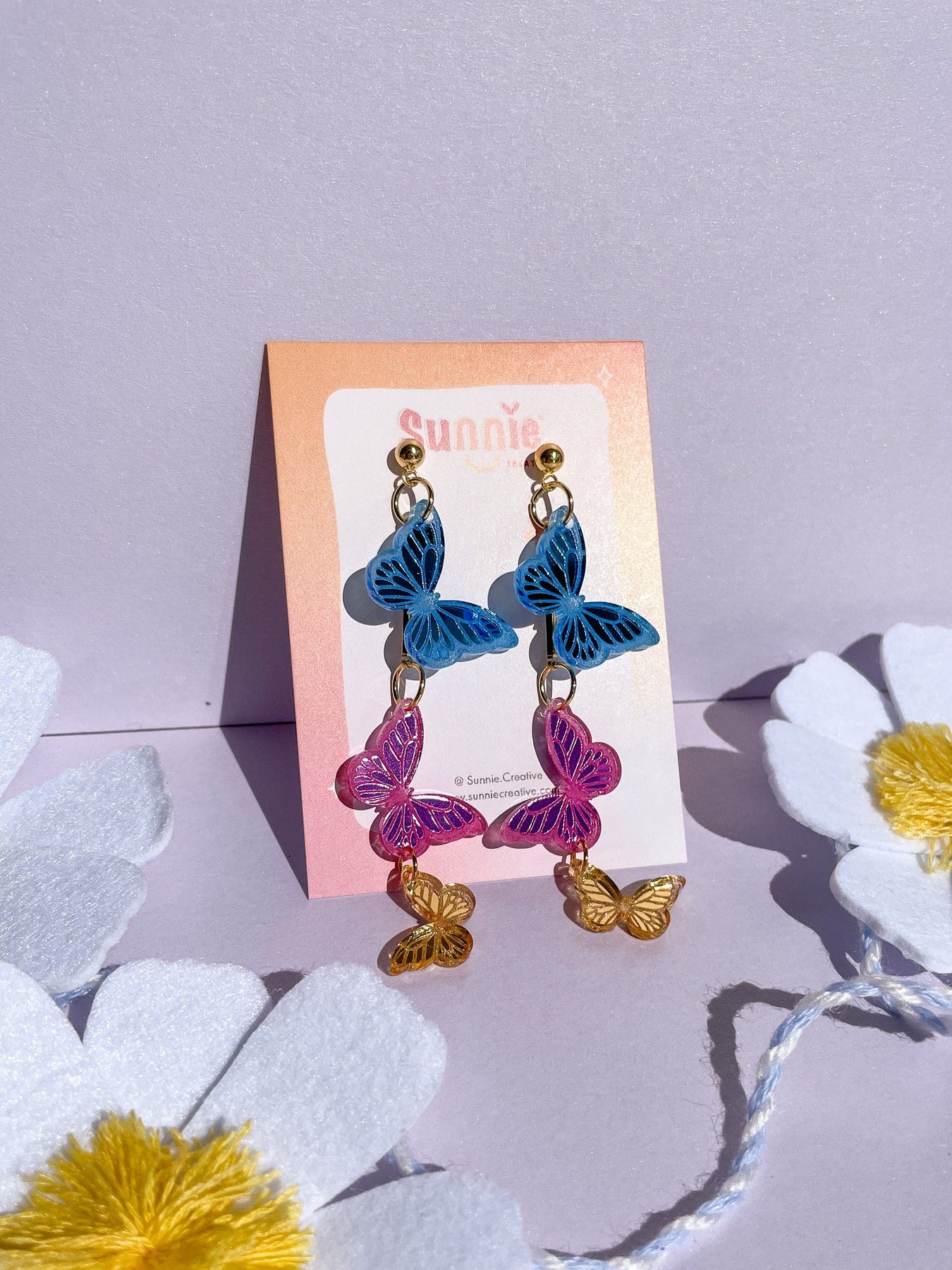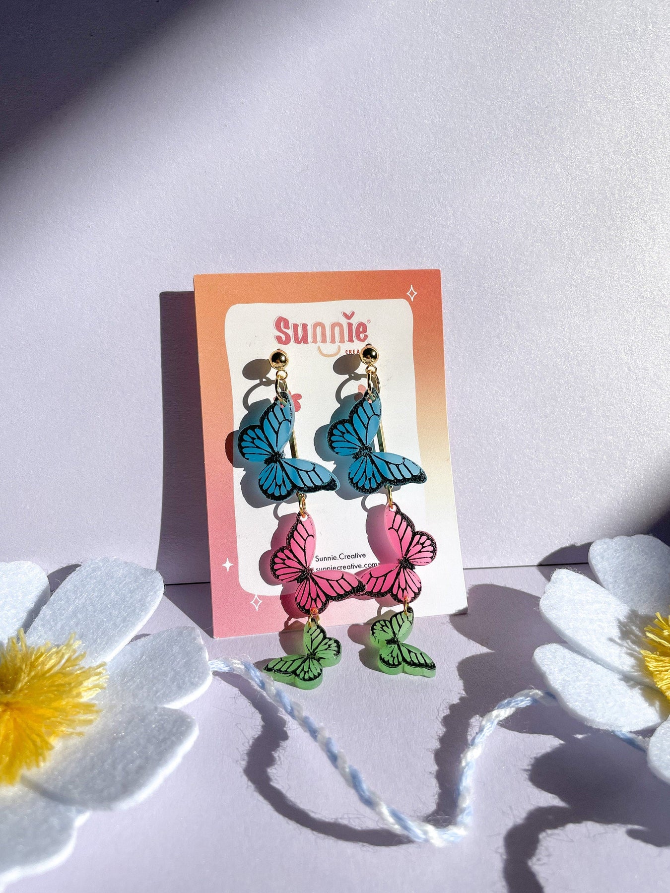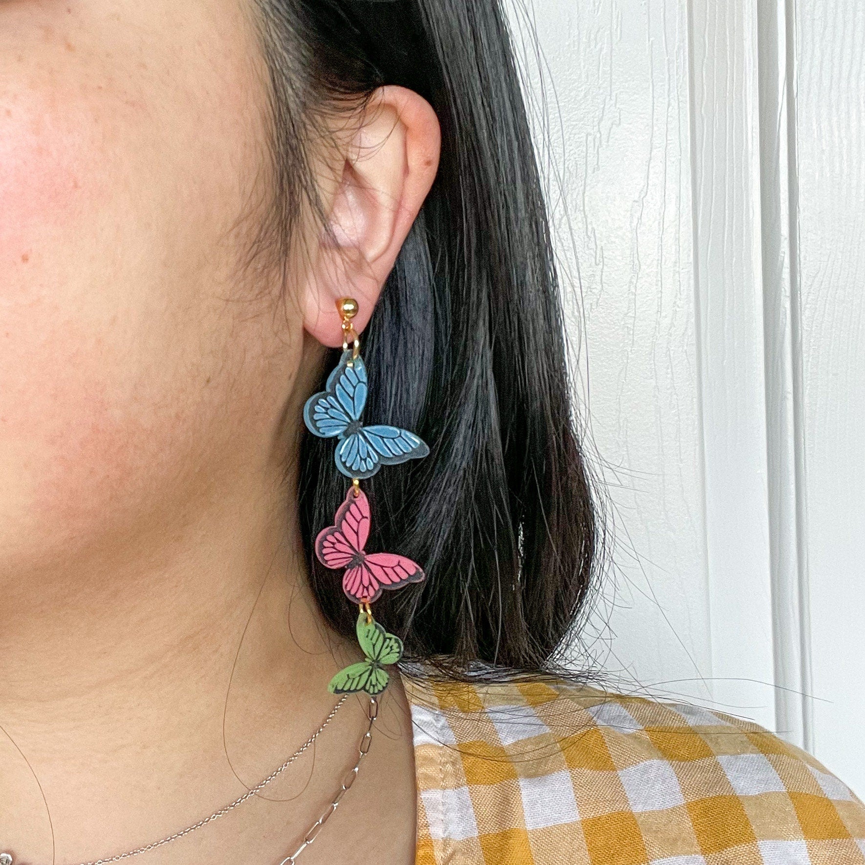 Kaleidoscope Butterfly earrings offer a unique statement to any look. Light up the night with beautiful glow in the dark colors, or opt for a great reflection in the day. Make a bold, colorful statement with these eye-catching earrings.