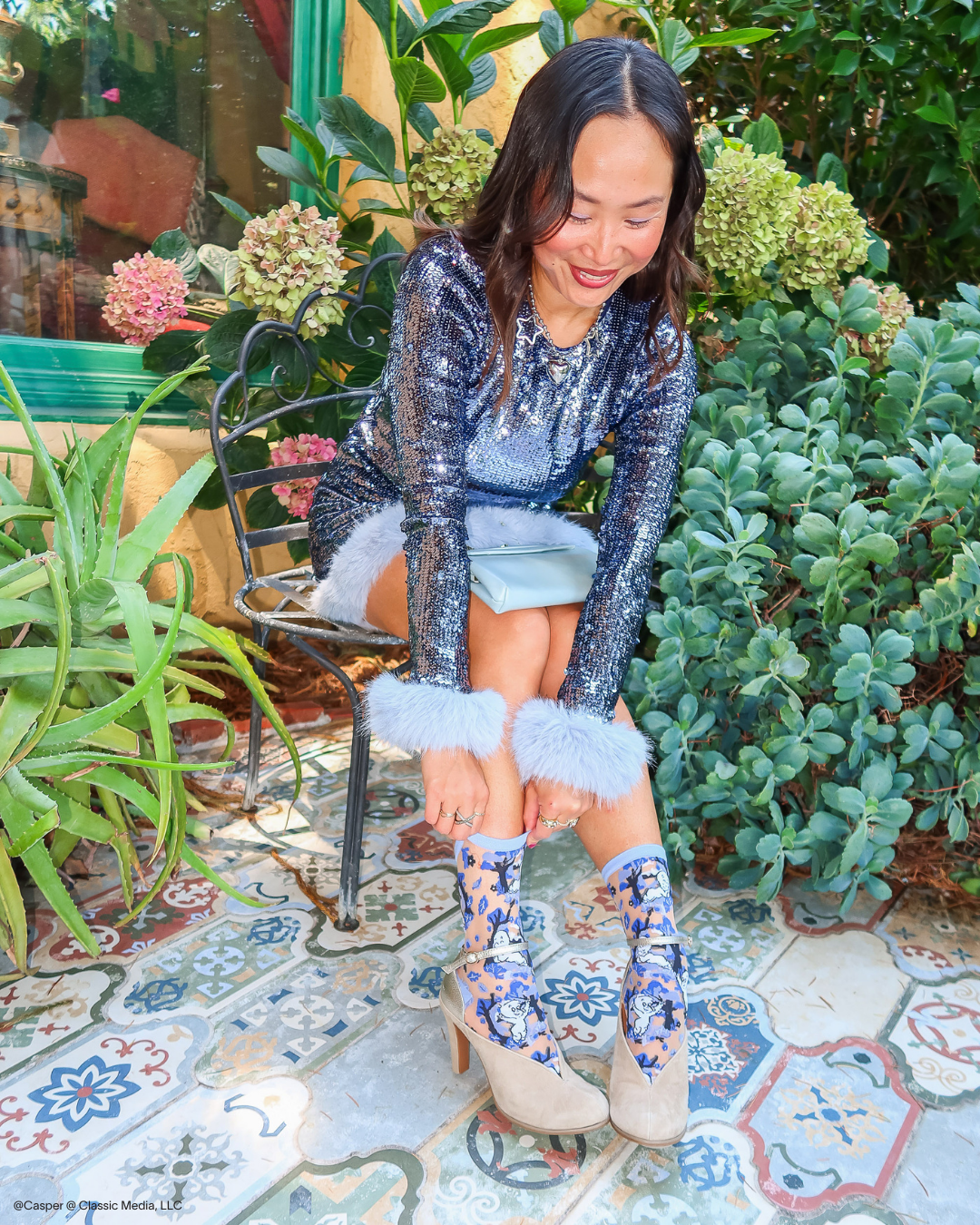 Get ready to haunt your wardrobe (in the cutest way possible) with the Casper and Trees sheer sock – a spellbinding collaboration between Sock Candy and Casper the Friendly Ghost™! These ethereal socks feature Casper himself gleefully floating among enchanted blue and black trees that pop against a sheer background. Accents of lavender-blue at the heel, toe, and cuff add a dreamy pastel finish. Whether you’re dressing up for Halloween or simply want a magical twist on your everyday style, these socks bring a spooky-chic accent to your look. One Size. Recommended fit US women's shoe sizes 5.5-10. 200 Needle Count. ✨ Funky yet elegant - no silly or childish patterns 🧦 Premium quality - durably made with comfortable stretch 👗 Unique - the perfect accessory to add individuality to your outfits