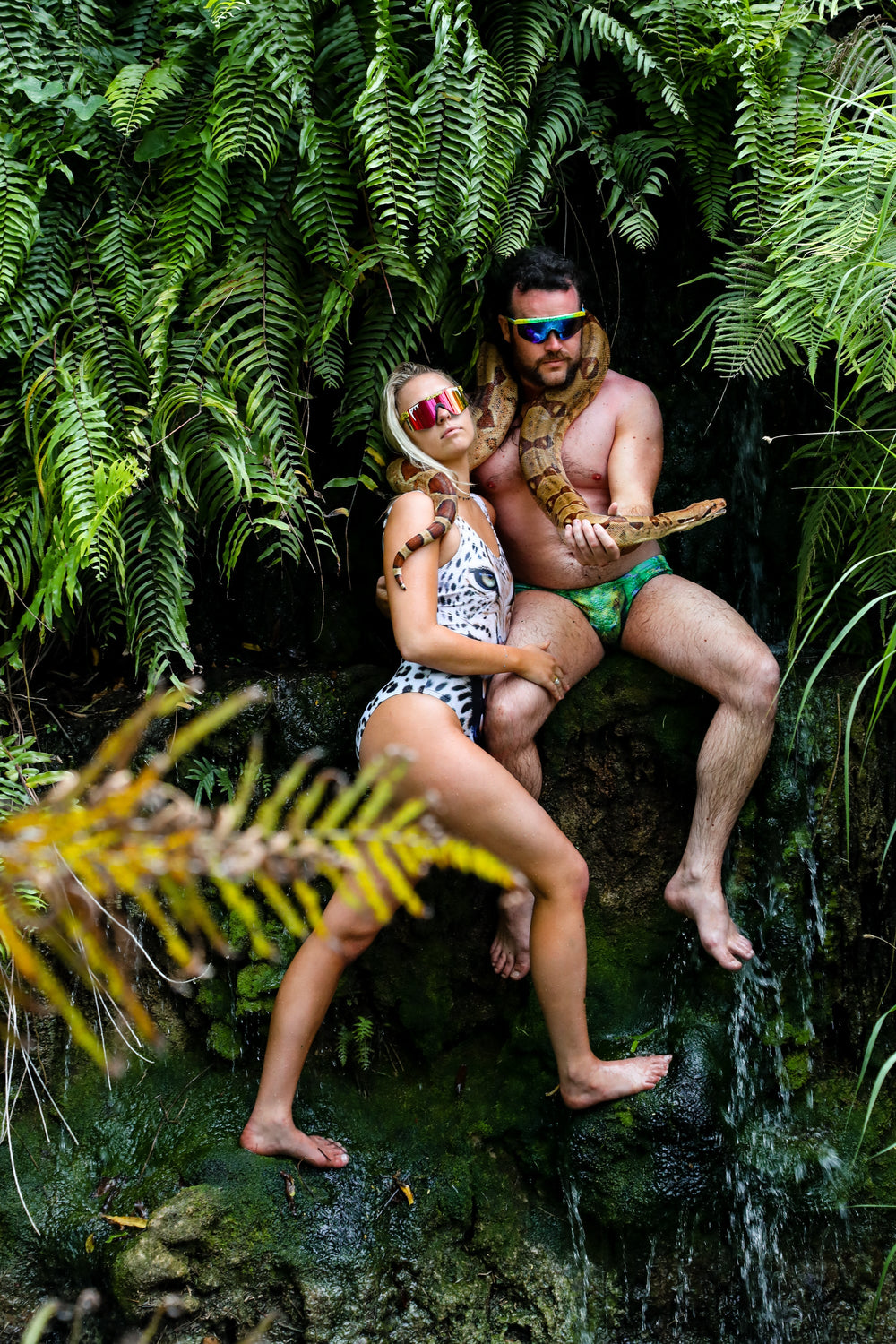 If you ever woke up on Saturday morning with a nice wedgie in your crack and Animal Planet's "The Jeff Corwin Experience" on the tele, these slippery snake swim briefs are for you. If you revel in the thought of your anaconda slithering into a Playa del Carmen beach bungalow, this green snake print bathing suit is for you. If you're at all worried about jamming your snake and eggs right back where they came from, these babies are definitely not for you.