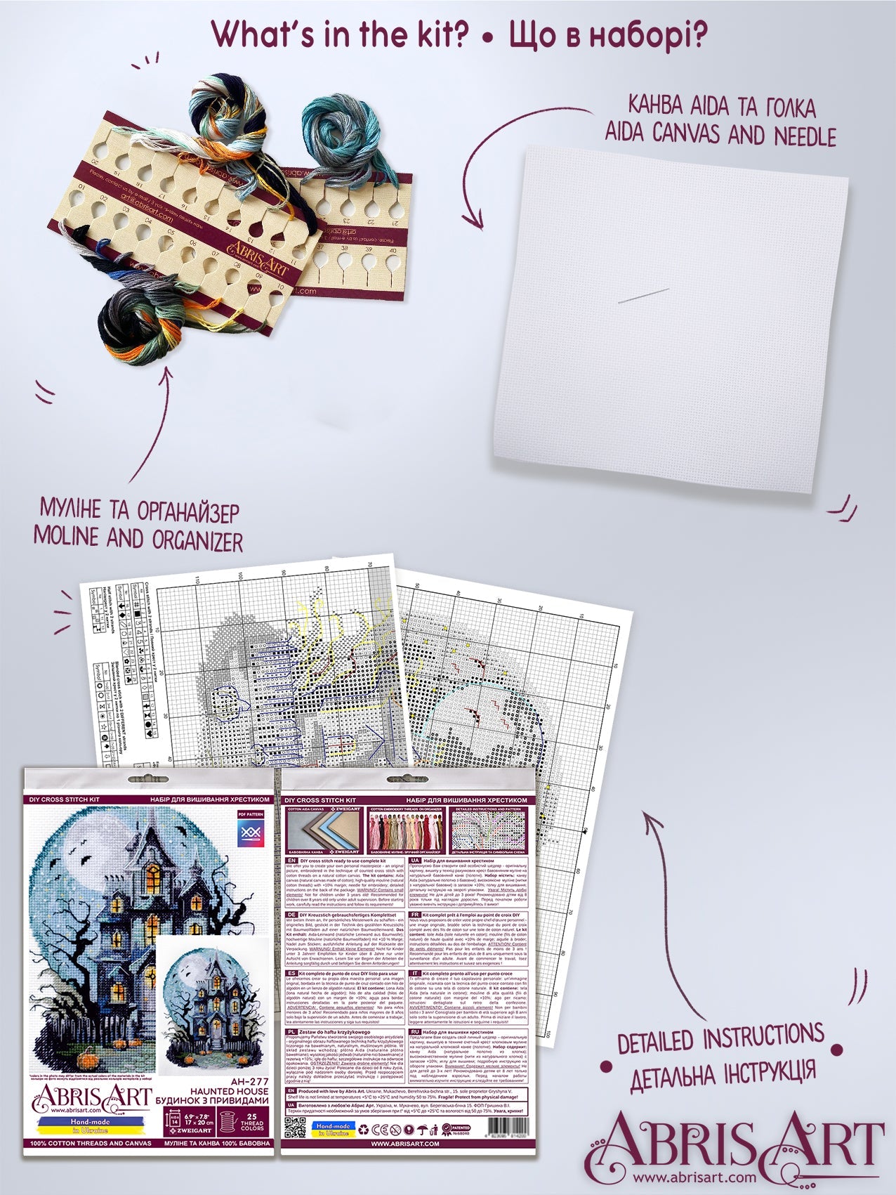 In each carefully assembled box Cross-stitch kits Haunted House (Deco Scenes) after purchase and delivery you will find: a large piece of canvas (embroidery fabric) larger than the size of the picture - 200 x 170 mm. - with enough margin to comfortably embroider and decorate the finished picture! As well as a special needle for cross-stitching and all the necessary threads (floss) - 25 colors on a convenient organizer, of course - with a margin, because you can embroider with a cross in different ways. And most importantly - detailed instructions, a cross-stitch pattern, specially designed by our designers for each set separately!