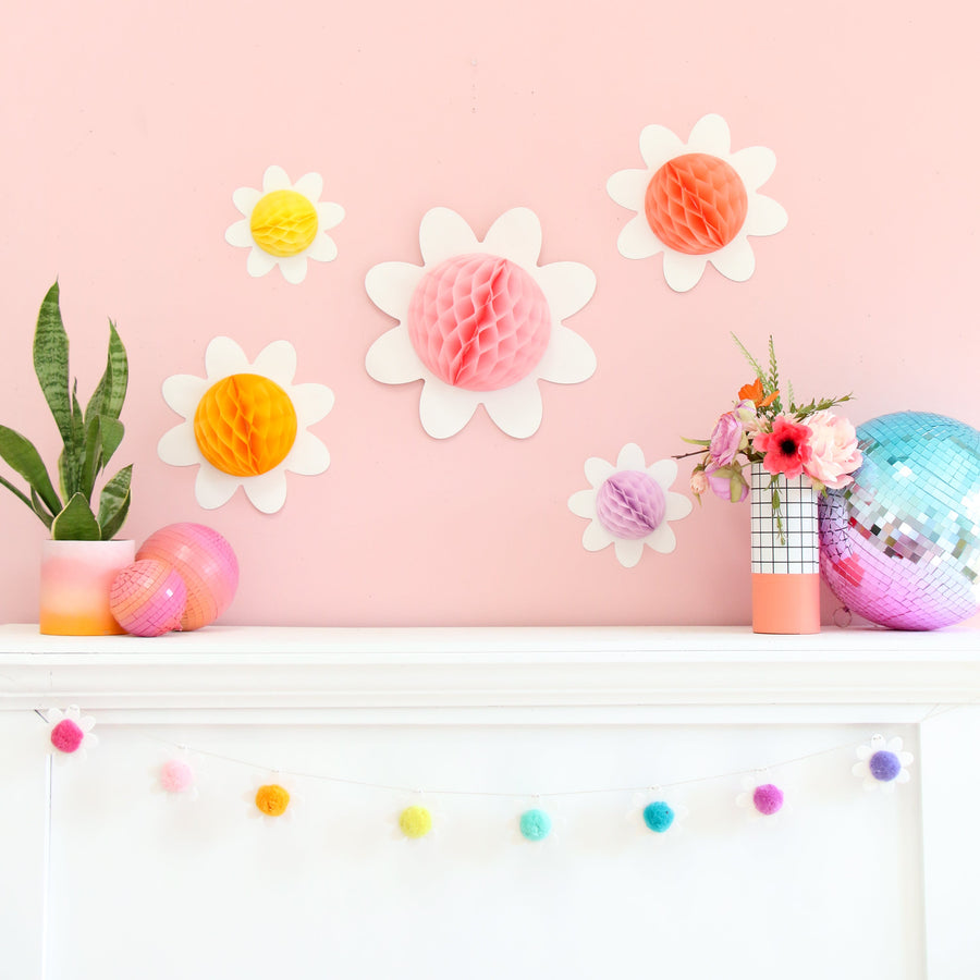 Set of 5 honeycomb daisies with iridescent glitter petals and honeycomb center. Daisies are 7"to 14" across.