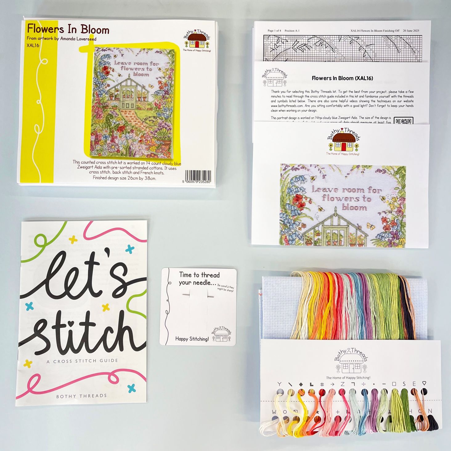 This counted cross stitch kit is worked on 14 count cloudy blue Zweigart Aida with pre-sorted stranded cottons. It uses cross stitch, back stitch and French knots.