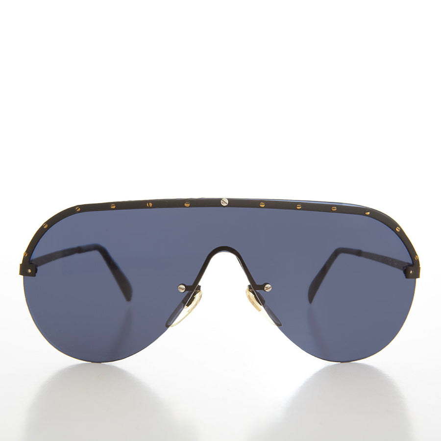This stylish aviator features a one piece rimless tear drop lens with a gold stud brow line. New old stock. Never worn. Great condition. UV protection.