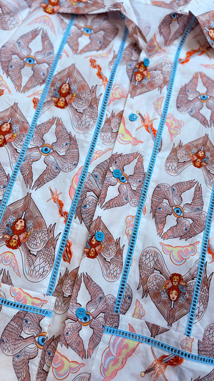 The new Men's Heavenly Bodies Cocktail Shirt is anything but scary. We're more than a little obsessed with this artwork, created exclusively for Wax Poetic by Philadelphia illustrator Kaitlin O'Donnell! This 100% cotton shirt is breathable, with bright blue trim and buttons, pockets, and a digital print that ensures longevity! This style is meant to be slightly oversized, if you'd like it to be more fitted we recommend sizing down.