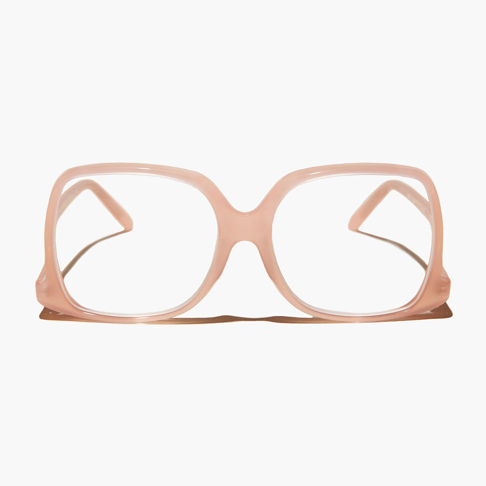 A hybrid of granny-chic and Farrah Fawcett foxiness, the neutral-pink Mia boasts a bold, oversized frame that belies its lightweight fit. Upside-down temples support the chunky frame to complete the retro 70s vibe. Choose from five far-out colors. Available as a bifocal or reader.