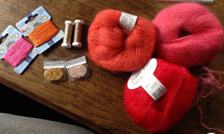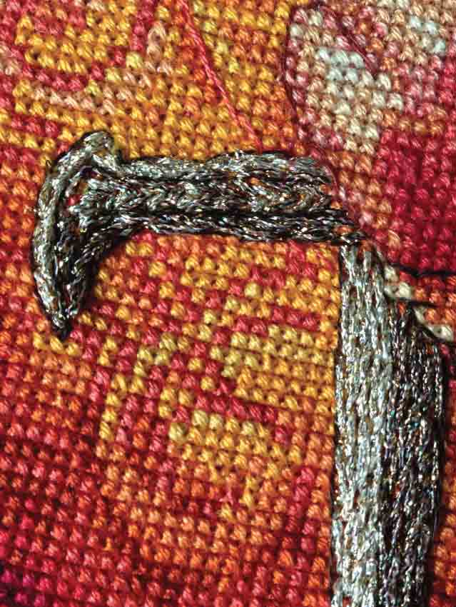 Kit contains: Red Linen Belfast 32 cts, 2 Metallic threads (Tonkin) Ets Toulemonde , 2 metallic threads Au Ver à Soie, 2 boxes of beads Cousines & Cie, 2 needles (embroidery + beads). Dimensions: 30x42cm / 11,81x16,54in