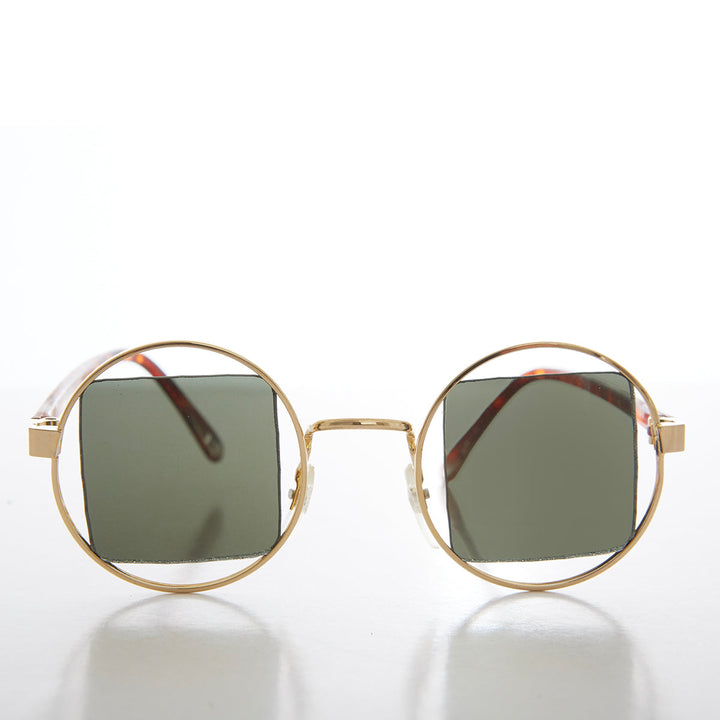 This fun and funky novelty sunglass features a round frame with a square lens.