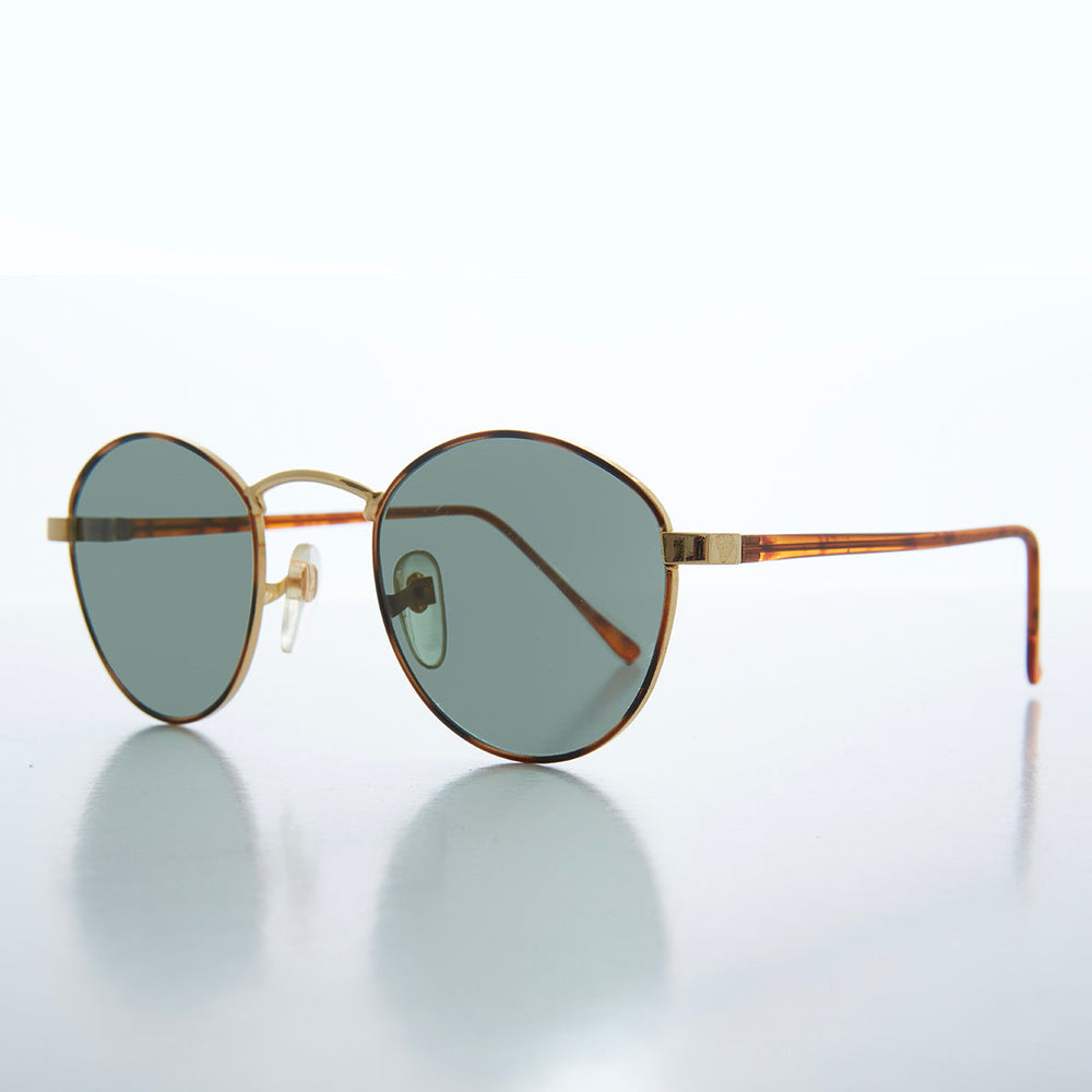 These always in style round sunglasses feature a gold and brown demi frame. Recommender for small-medium face shapes. New old stock. Never worn. Great condition. UV protection.