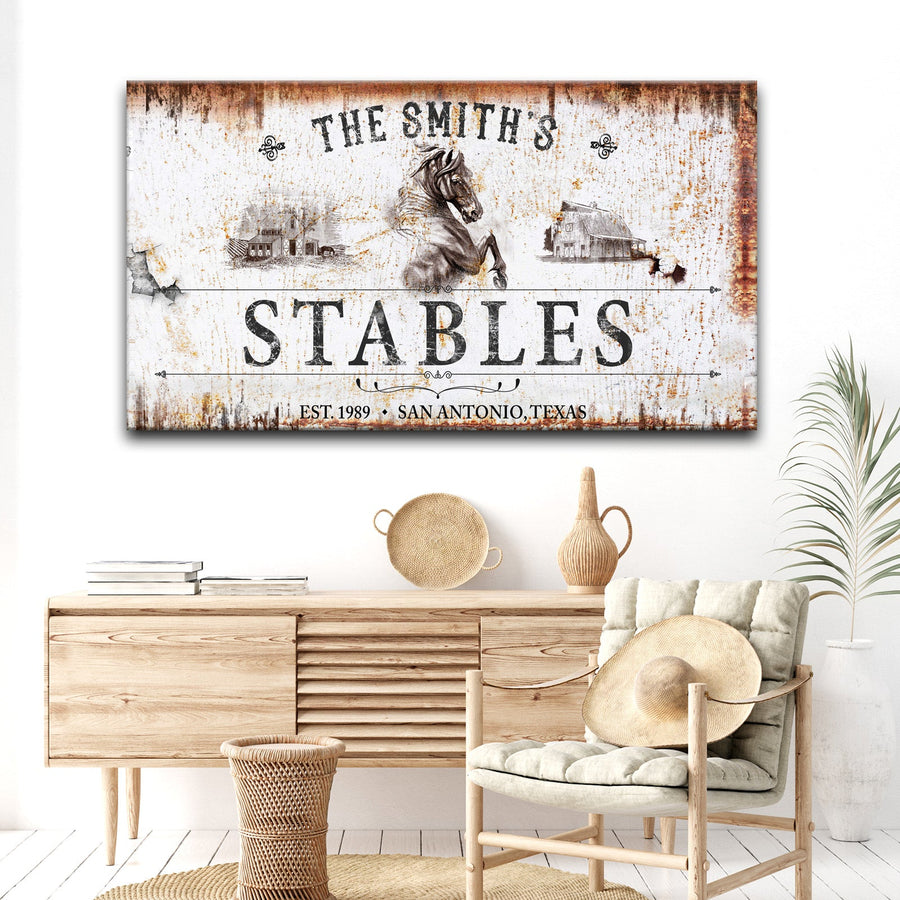 The rustic design of the sign is perfect for any western-themed room, and the canvas print is ready to hang on any wall. So if you're looking for a way to bring back the spirit of the ranch, look no further than our rustic stables canvas print. You can also customize your rustic stables sign with your preference of name, image, font, theme, or a quote that you love.