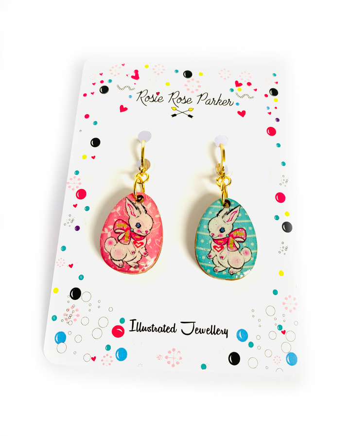 Hop into the Easter season with Rosie Rose Parker's Layla the bunny drop earrings! These cute earrings, featuring a magical bunny, come in light pastel green and pink. The resin on wood creates a unique glass effect, perfectly paired with comfy gold plated huggie hoops. Brighten up your day with these bunny-themed earrings, measuring 6cm x 6cm.