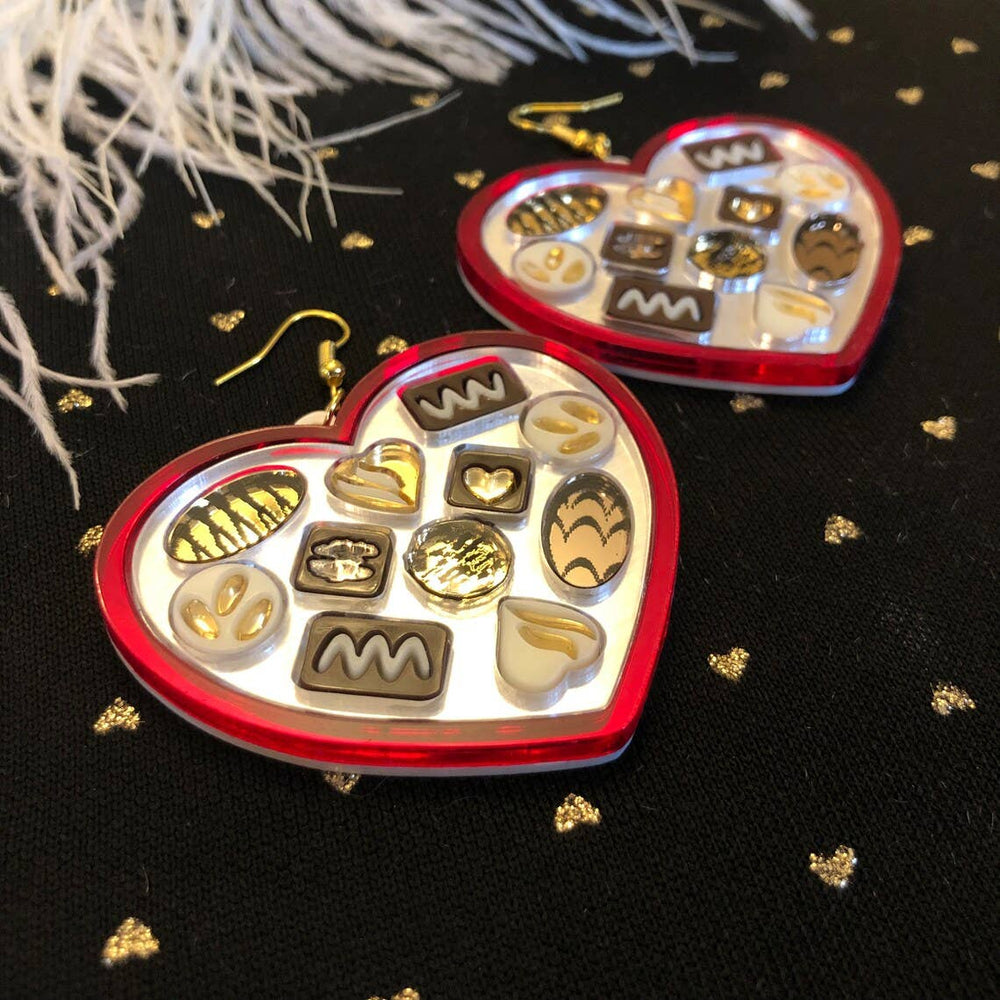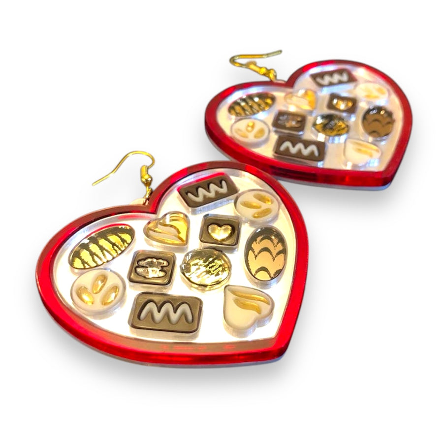 Indulge in nostalgia and romance with these chocolate-inspired earrings. Each delicious chocolate is detailed with intricate etching or tiny cut details, and designed on a computer before being laser cut from acrylic. At a size of 2.25" wide and 2" tall, these pendants hang from gold ear hooks for a sweet and elegant touch.