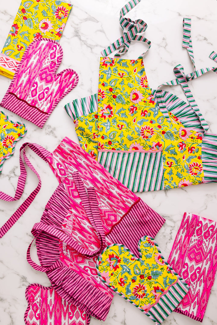 Chic and timeless, this pretty blockprint pot holder elevates the everyday and adds a colorful charm to your kitchen. Handmade in India, the charming color combo and the striped trim make a bold statement. By opting for sustainable table linens over disposable, we can help cut down on waste and support an age-old craft by artisans in Jaipur.