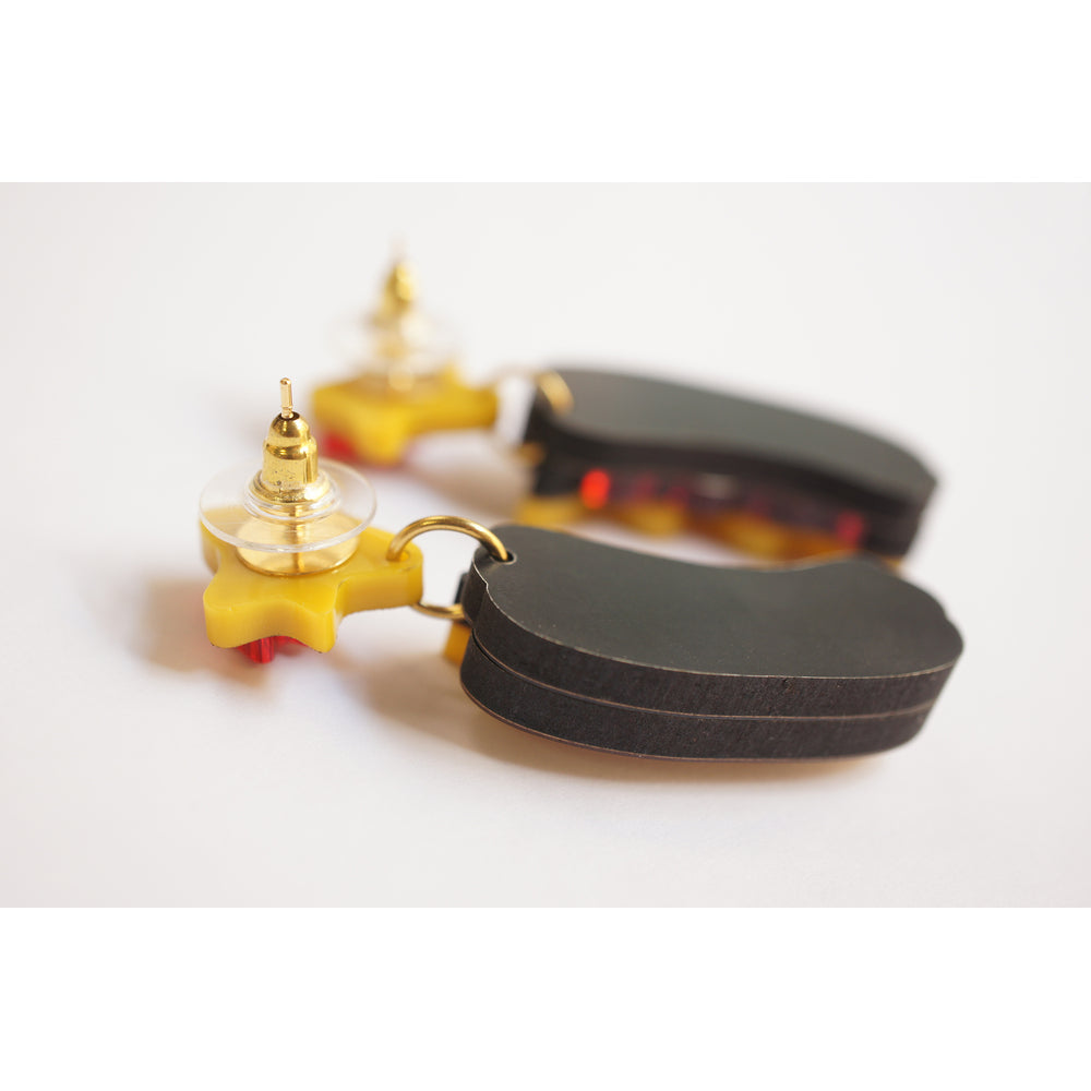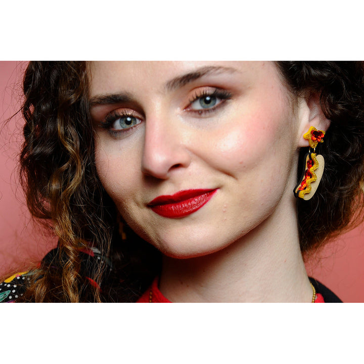 Hot dog-shaped earrings, crafted from wood using the sublimation technique, with acrylic details: mirror-effect red and glitter yellow for a bright and fun touch.