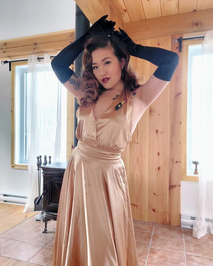 Crafted from a lustrous gold fabric that catches the light with every step, this dress radiates opulence and extravagance. The halter neckline, reminiscent of the iconic '70s fashion, ties elegantly at the back of the neck, allowing you to adjust the fit to your liking. The deep plunging neckline creates a sultry and seductive look, revealing just enough skin to make a statement while remaining tasteful.