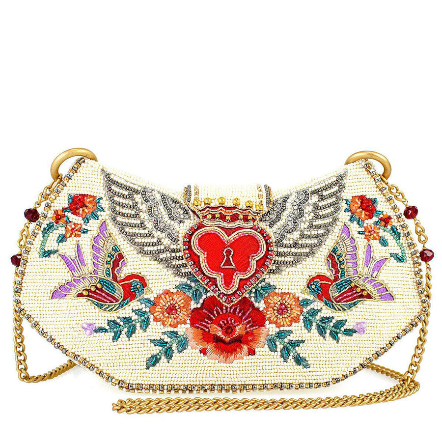 Unlock timeless charm with this handbag featuring a winged heart locket and delicate floral details. A perfect treasure to carry your essentials with grace and flair.