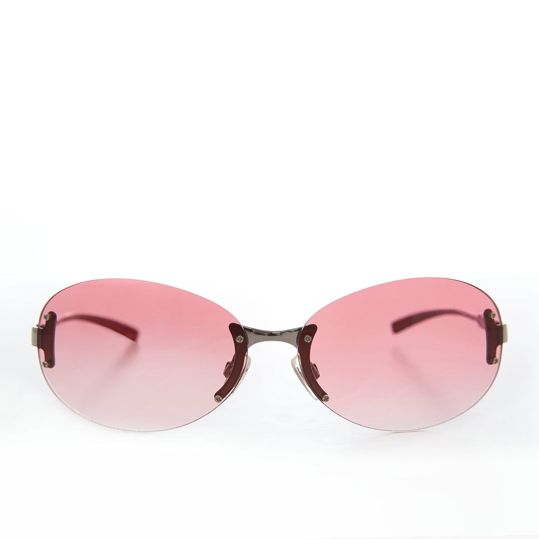 This unisex sunglass features a rimless oval color tinted lens with matching translucent temples. New old stock. Never worn. Great condition. UV protection.