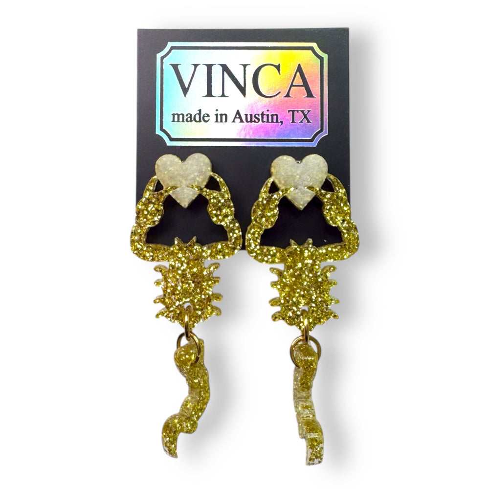 Glitter gold scorpions with a little articulated tail, hanging for dear life onto a little frosty heart, ouch!