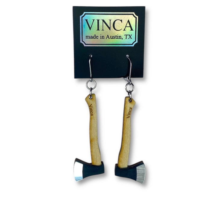 Random Axe of Kindness Earrings are cut from Baltic birch wood and two layer plastic. Plastic blade of the axe is on just the front of the earring. These baby axes are not sharp. I doubt you could even cut room temp brie with these things.