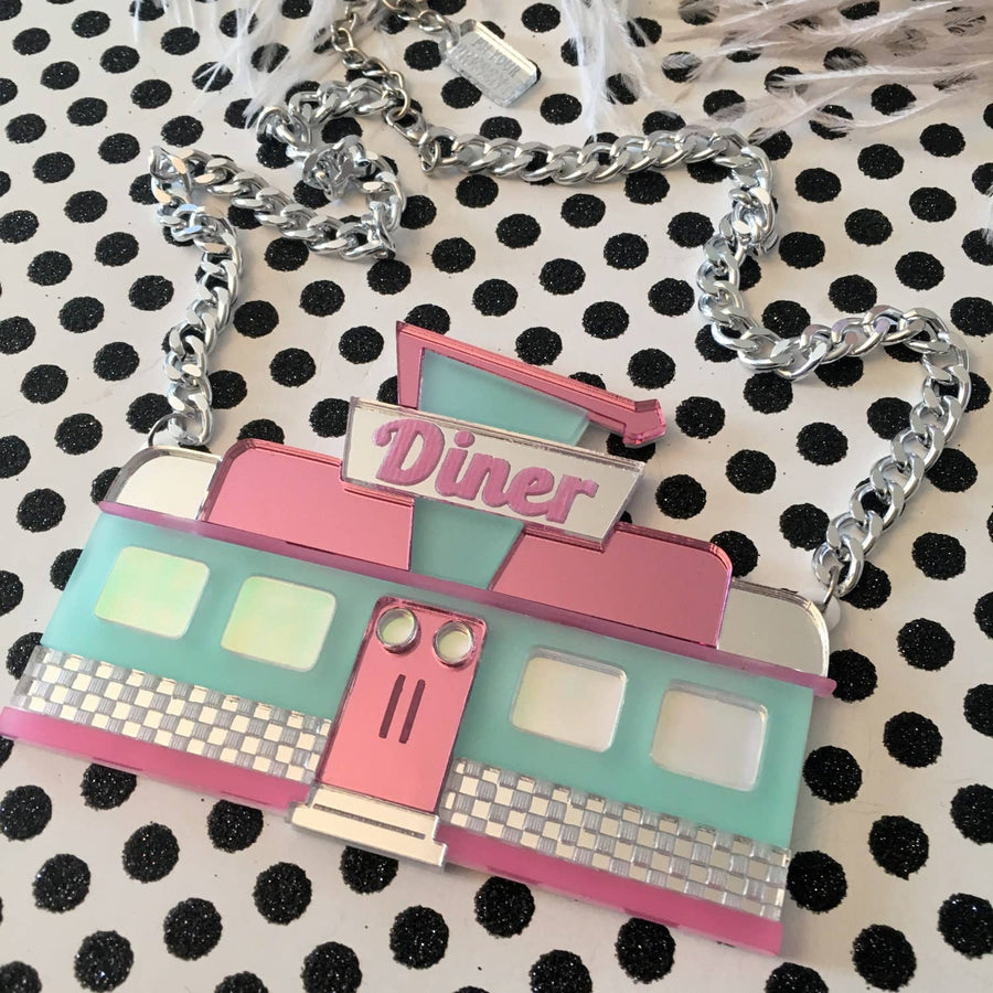 Who doesn't love diners? This original design has been laser cut out of a mix of 1/8" thick acrylic sheets and is backed with white, 1/16" thick acrylic. The pendant measures about 4" wide by 3" tall. The necklace hangs from a thick, silver chain that measures 16" long with a 3" extender chain so you can decide which length you want to wear it. And if you'd like it longer or shorter, just let me know in the 'notes to seller section' at checkout! We love these necklaces and think that they never get old. However, to prolong the life of yours, treat it with love! Be careful when storing it in a bag or pocket so that it does not break. Also, avoid getting any and all jewelry wet. Take it off and keep it out of the way of all showers, baths, pools, hot tubs, saunas, and sensory deprivation tanks.