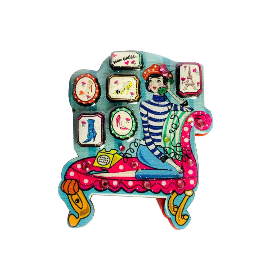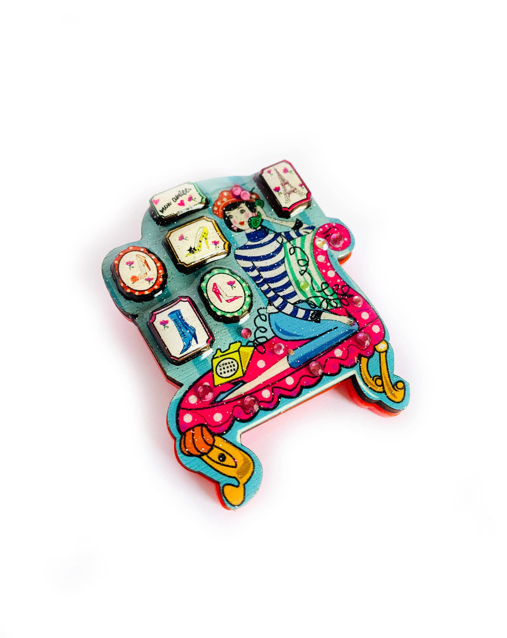 A super colorful French-inspired accessory featuring Juliette discussing her love for shoes. Adorned with gems, this 6cm x 5cm brooch is handcrafted in our studio and comes with a stainless steel backing. The perfect funky gift for the shoe lover in your life. Oh la la!