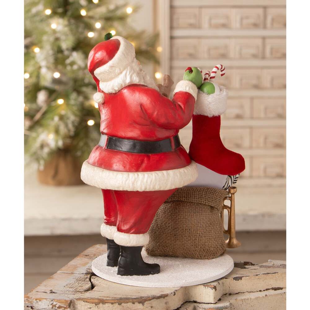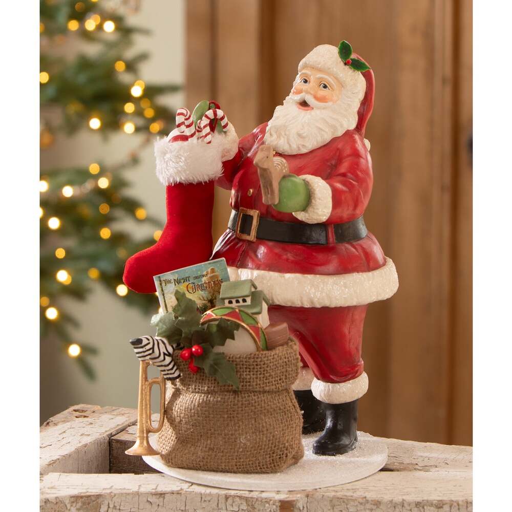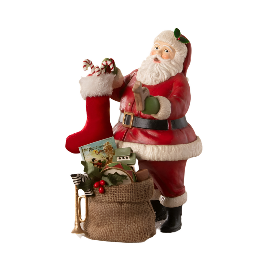Celebrate the spirit of Christmas with our Classic Santa Filling the Stocking Christmas Collectible. This timeless Santa figure, dressed in his iconic red suit, is joyfully preparing for the holiday season. In one hand, he holds a festive stocking, while the other cradles a charming toy horse. At his feet, a bag spills over with an assortment of toys, capturing the heartwarming essence of gift-giving. With intricate hand-painted details, sparkling glitter and festive accents like lacquer holly, this 12-inch piece exudes nostalgic holiday charm. Perfect for adding a touch of classic Christmas magic to your collection!