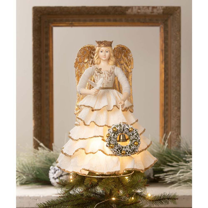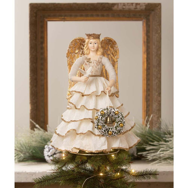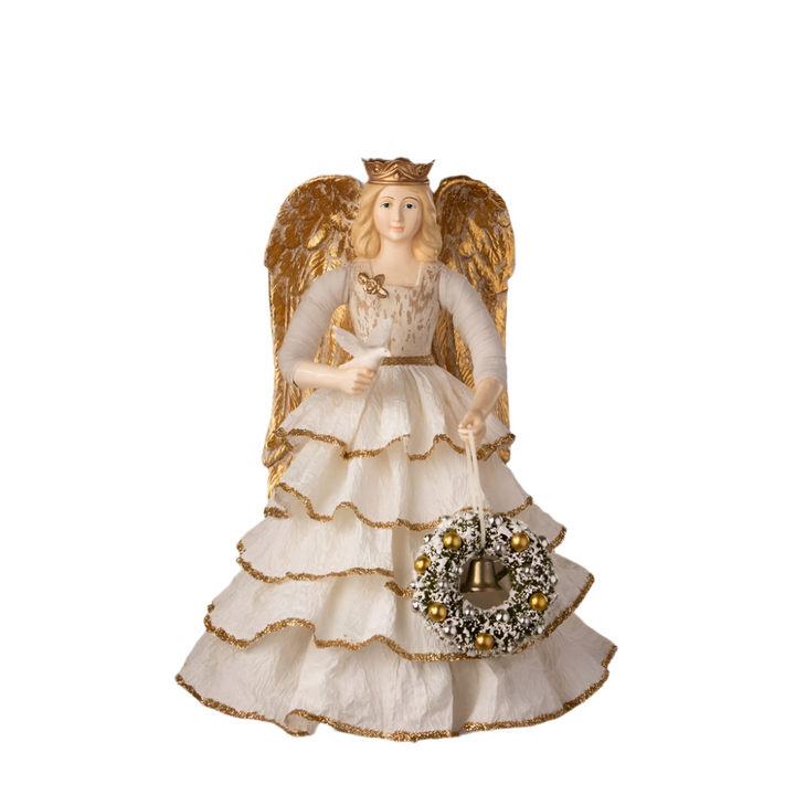 Introducing our vintage Santos-inspired angel tree topper, a stunning addition to your Christmas tree. This elegant angel features a wire hoop beneath her off-white paper ruffled skirt, allowing the warm glow of Christmas lights to shine through and illuminate her graceful figure. Her wire-wrapped arms, adorned with soft white batting, hold a dove and a green bottle brush wreath decorated with gold balls, with a gold bell at its center. The angel's metallic gold sculpted wings add a divine touch, while the purposely distressed bodice gives her a charming vintage look. Each hand-painted piece is unique, with variations in the distressed areas, making her one-of-a-kind. At 9" x 9" x 14", this angel will bring timeless beauty to the top of your tree, adding a touch of nostalgia and warmth to your holiday decor.