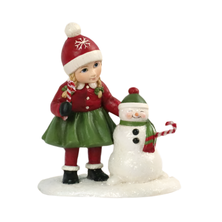 Susie is all bundled up in her cozy winter attire, ready for a fun-filled day of building the perfect snowman! She's dressed in a festive red top, a green skirt, red leggings, and a charming red-and-white stocking hat adorned with a snowflake in front. With a big smile, she carefully places chenille candy cane arms on her new snowman friend, bringing him to life. This delightful figurine is a wonderful addition to any Christmas children's collection, capturing the magic and joy of the holiday season.