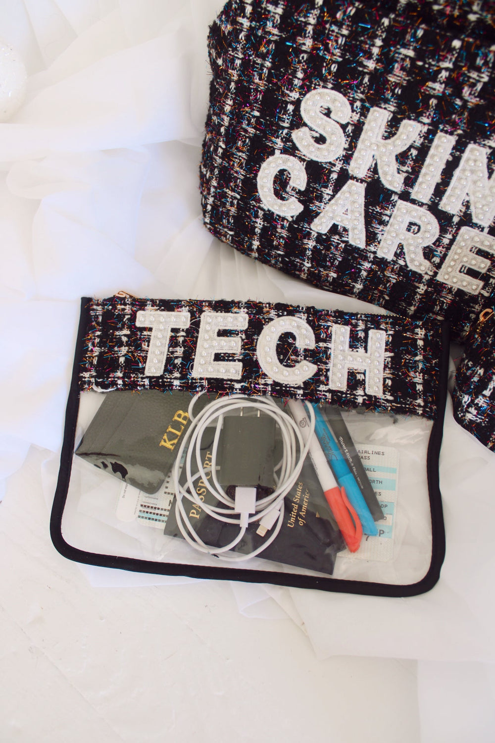 Transparent Pouch is not only practical but also adds a touch of elegance to your everyday life. Our TECH pre-made clear pouch ships the same or the NEXT day! Fill it with all of your favorite travel essentials like your phone charger, snacks, AirPods + more!