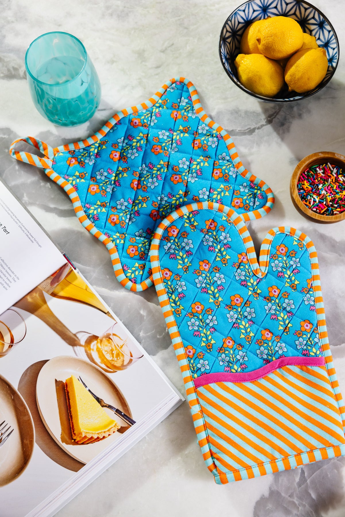 For the ones who know that cooking should be as vibrant as it is fun. This colorful pot holder and oven mitt set is for those who bring bold flavors and even bolder style into the kitchen.