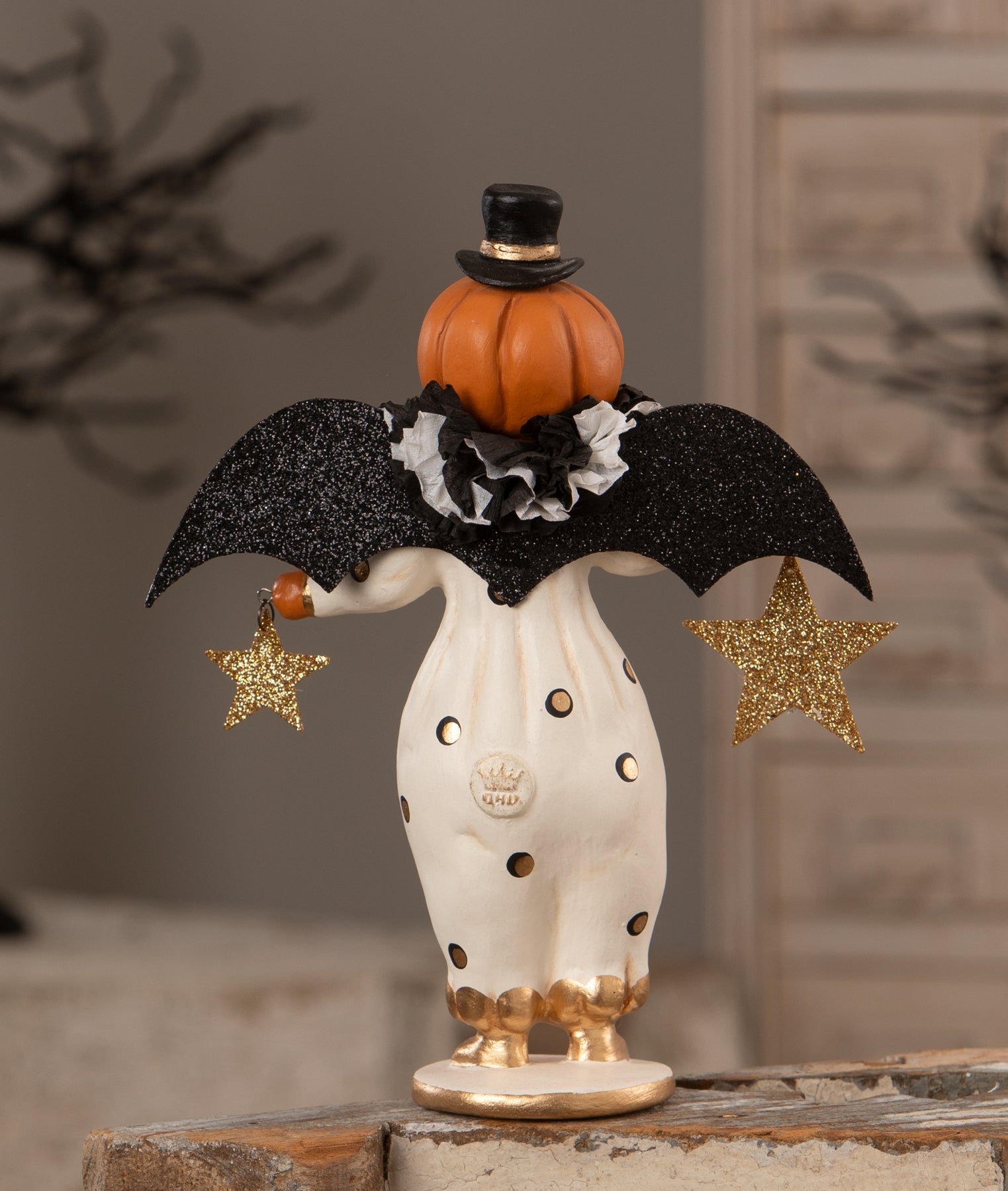 Add a touch of festive whimsy to your Halloween collection with Little Fancy Pants Jack by Dee Foust-Harvey. This pumpkinhead figure is dressed in a playful polka-dotted clown costume, complete with charming paper bat wings. He holds glittered stars that sparkle with Halloween magic, making him the perfect accent for shelves, mantels, or seasonal displays. A delightful piece for collectors and lovers of vintage-inspired Halloween decor, Little Fancy Pants Jack is full of character and charm in a petite size.