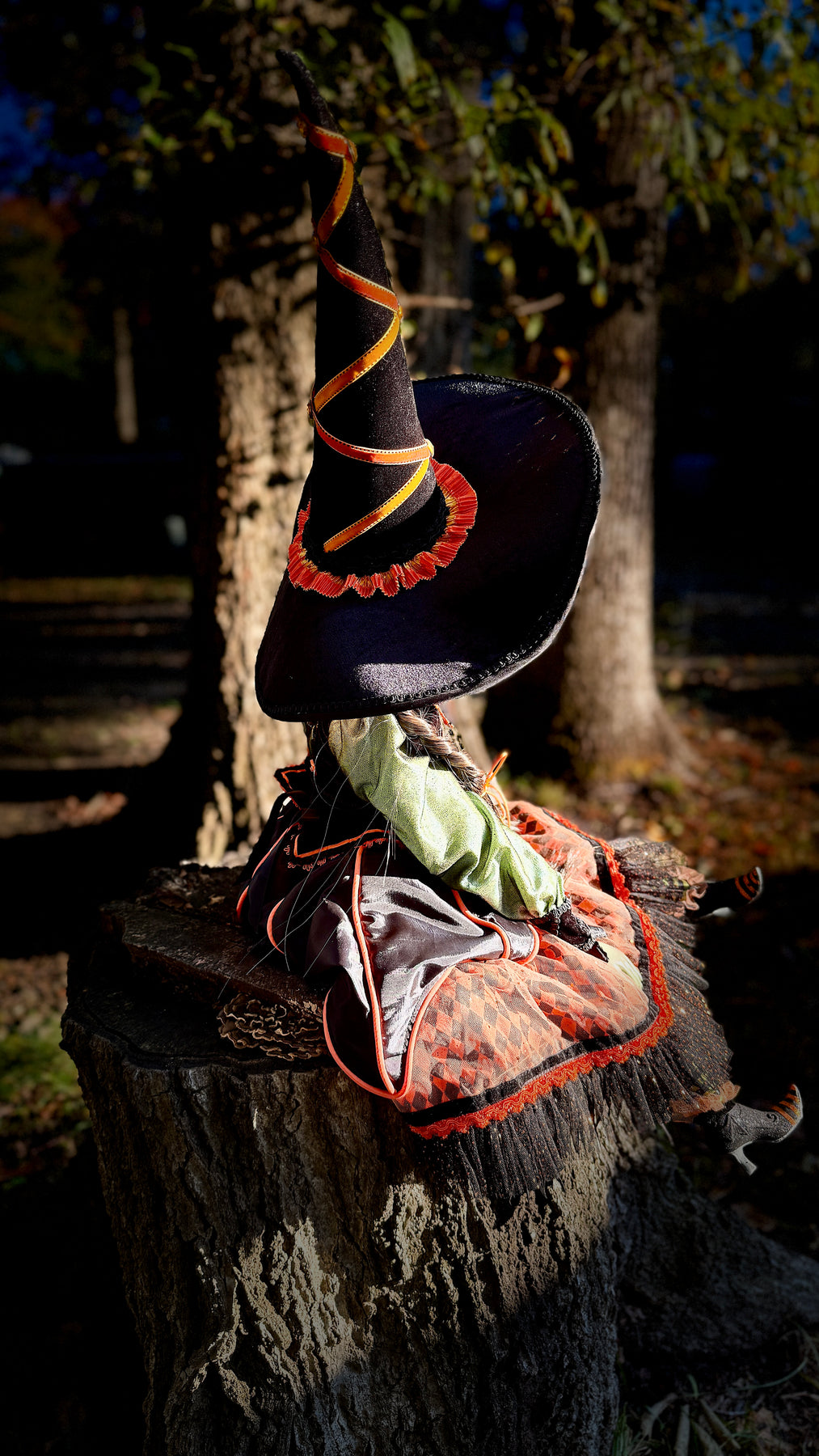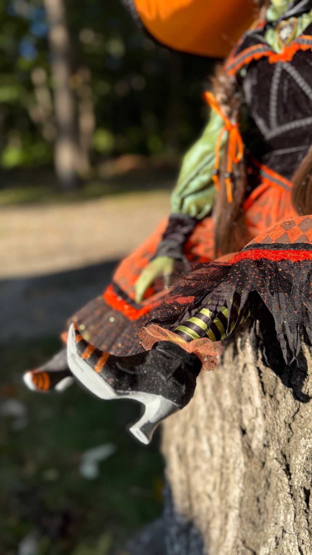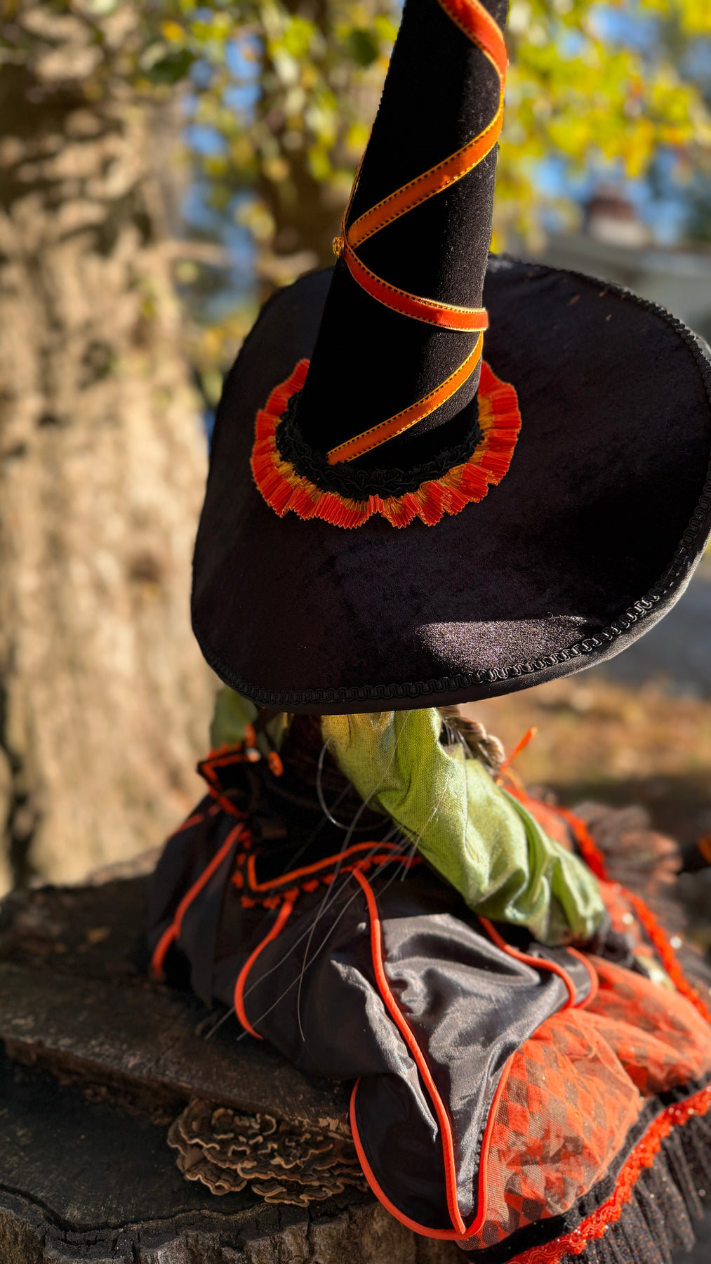 Lucinda Jinx stands an impressive 42 inches tall, bringing bewitching charm from Katherine's Collection 2021 lineup. This beautifully spooky display piece captures the essence of Halloween magic with intricate details and enchanting character. Used as store display, she's in excellent condition with only one missing orange ribbon from a pigtail—a minor detail that doesn't diminish her captivating presence. Perfect for collectors seeking a statement-making witch doll with authentic vintage appeal and delightfully eerie personality.