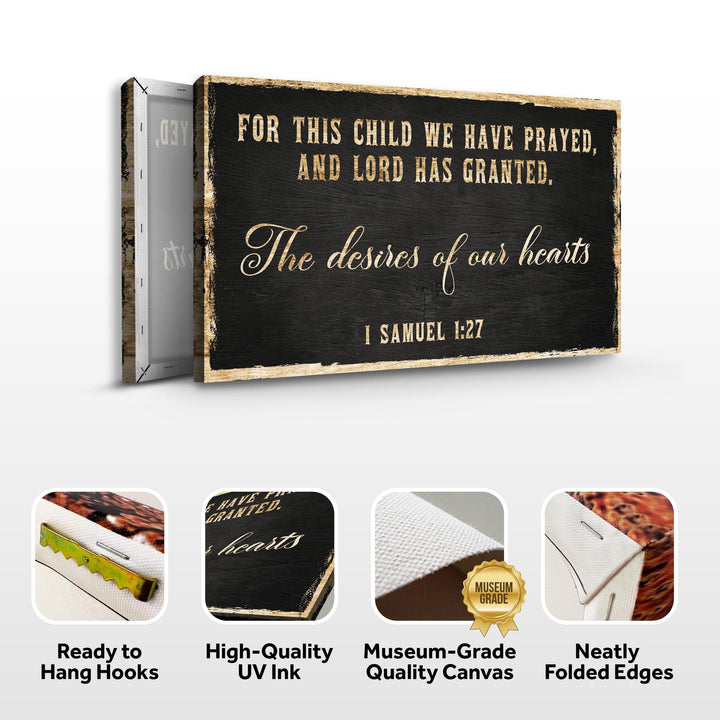 The ideal approach to convey to the world your gratitude for your children is through 1 Samuel 1:27 For The Child We Have Prayed wall painting. Everyone who sees it will be moved by the message's clarity and strength. The canvas print of 1 Samuel 1:27 For The Child We Have Prayed serves as a reminder that our children are God's gifts, and that we should constantly value them. To serve as a daily reminder to be thankful for your blessings, hang this work of art in your house. It is a lovely present for new parents or grandparents to use to welcome a child into the family.