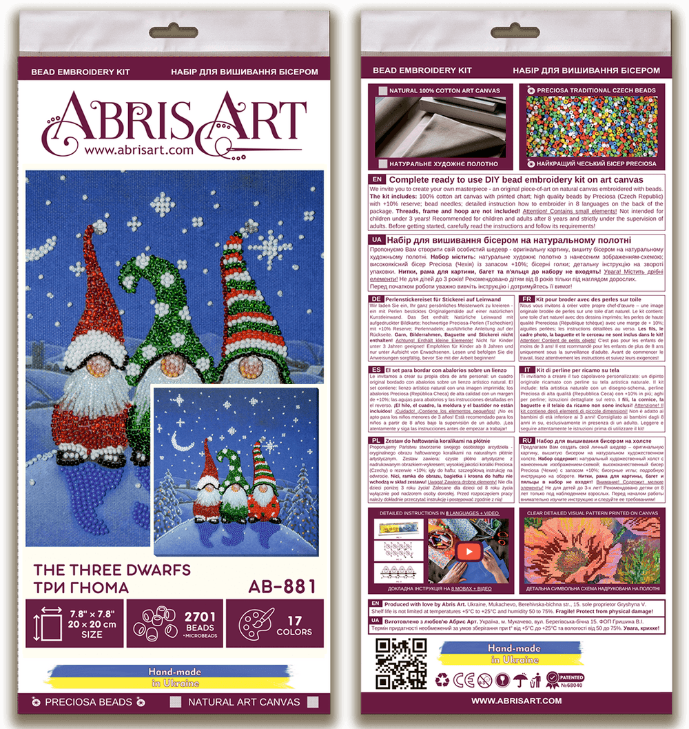 Kit contains: In each carefully assembled box Main Bead Embroidery Kit The three dwarfs (Deco Scenes) after purchase and delivery you will find: a large piece of natural art canvas with a printed image-scheme (fabric for embroidery) larger than the size of the picture - 200 x 200 mm. - with enough stock to make it convenient to embroider and design the finished picture! The world's best beads Preciosa Ornela (Czech Republic), with "stock" - more than 2701 beads, high-quality bead needles from Japan , and most importantly - detailed instructions, the scheme for beadwork with a key, specially developed by our designers for each plot separately and already applied to the canvas! It is so convenient and clear that even a person who wants to try himself in beadwork for the first time, and buy this kit - will understand everything in 5 minutes! The set is additionally completed with Preciosa beads #13 - microbeads - 2 colors, a needle for embroidery with microbeads. The possibility of gallery design of the embroidered picture is provided (without baguette, without passepartout) (Beads 17 colours). Dimensions 20*20cm / 7,87*7,87in. Made in Ukraine.