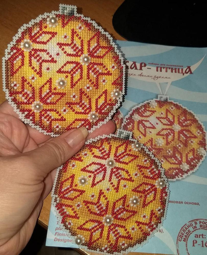 MP Studia counted cross-stitch set. Christmas tree decoration is stitched on the both sides with beads and threads. Cross-Stitch base is plastic canvas. Cotton threads. It is new, unopened kit.