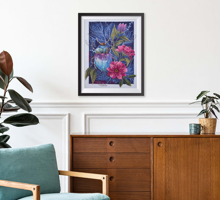 The set is completed with canvas 320*400 mm white color count 14, threads 105 m (of which decorative metallized thread golden color 6 m).