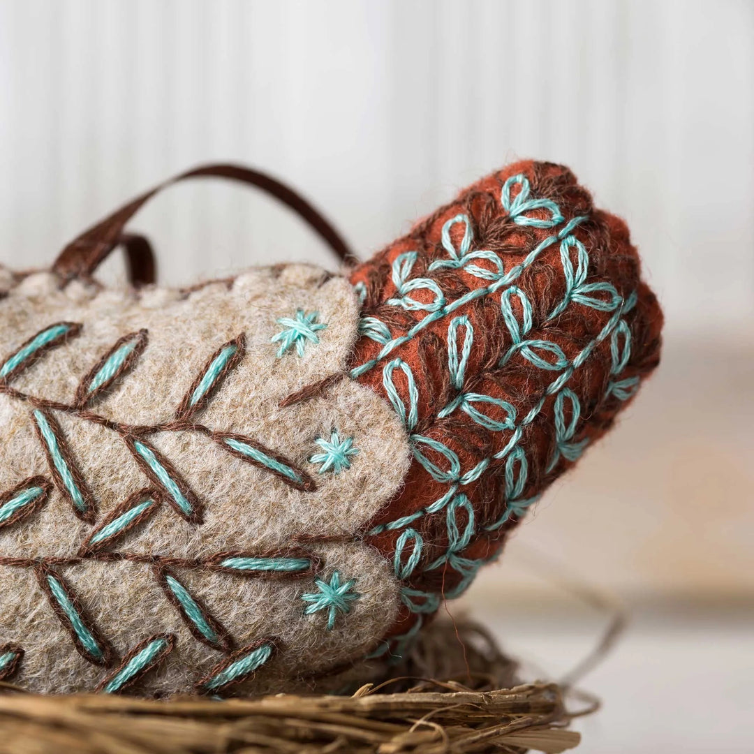 All Corinne's kits include everything you need (with the exception of scissors!) to realize the project including soft wool mix felt, embroidery thread, a needle, toy filling and ribbon.