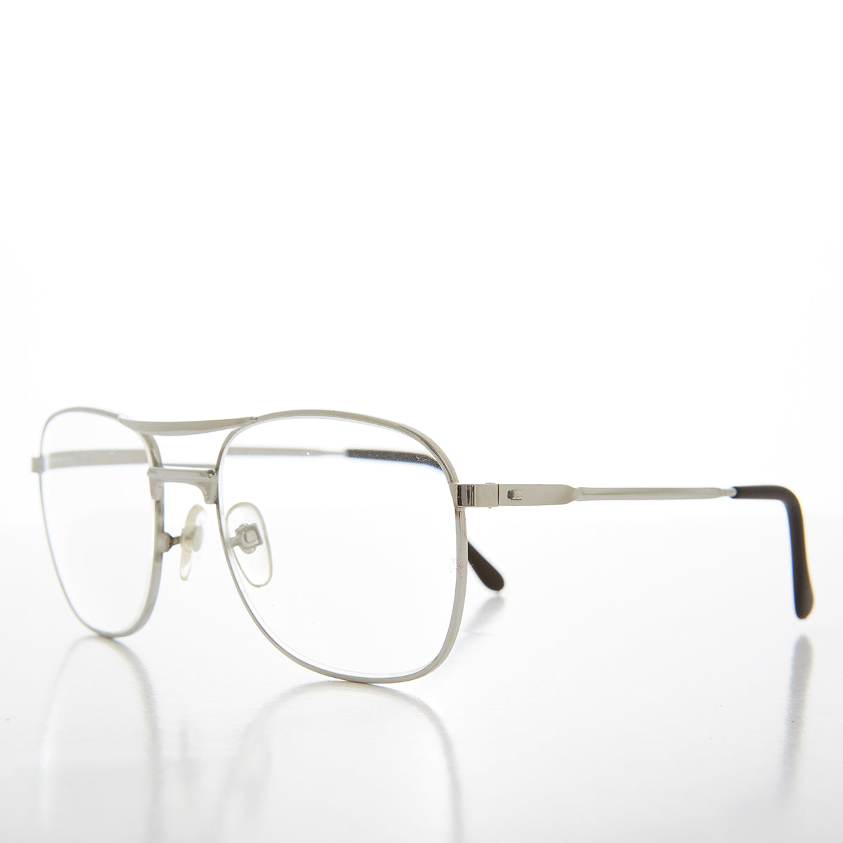 These 80s reading glasses feature a metal square aviator shape frame with a full reading glass lens. New old stock. Never worn. Great condition.
