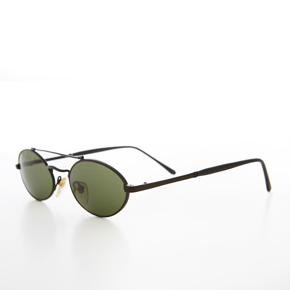 This sleek and streamlined sunglass features an oval frame and brow bar and acetate/metal combination temples. This frame is prescription friendly too. New old stock. Never worn. Great condition. UV protection.