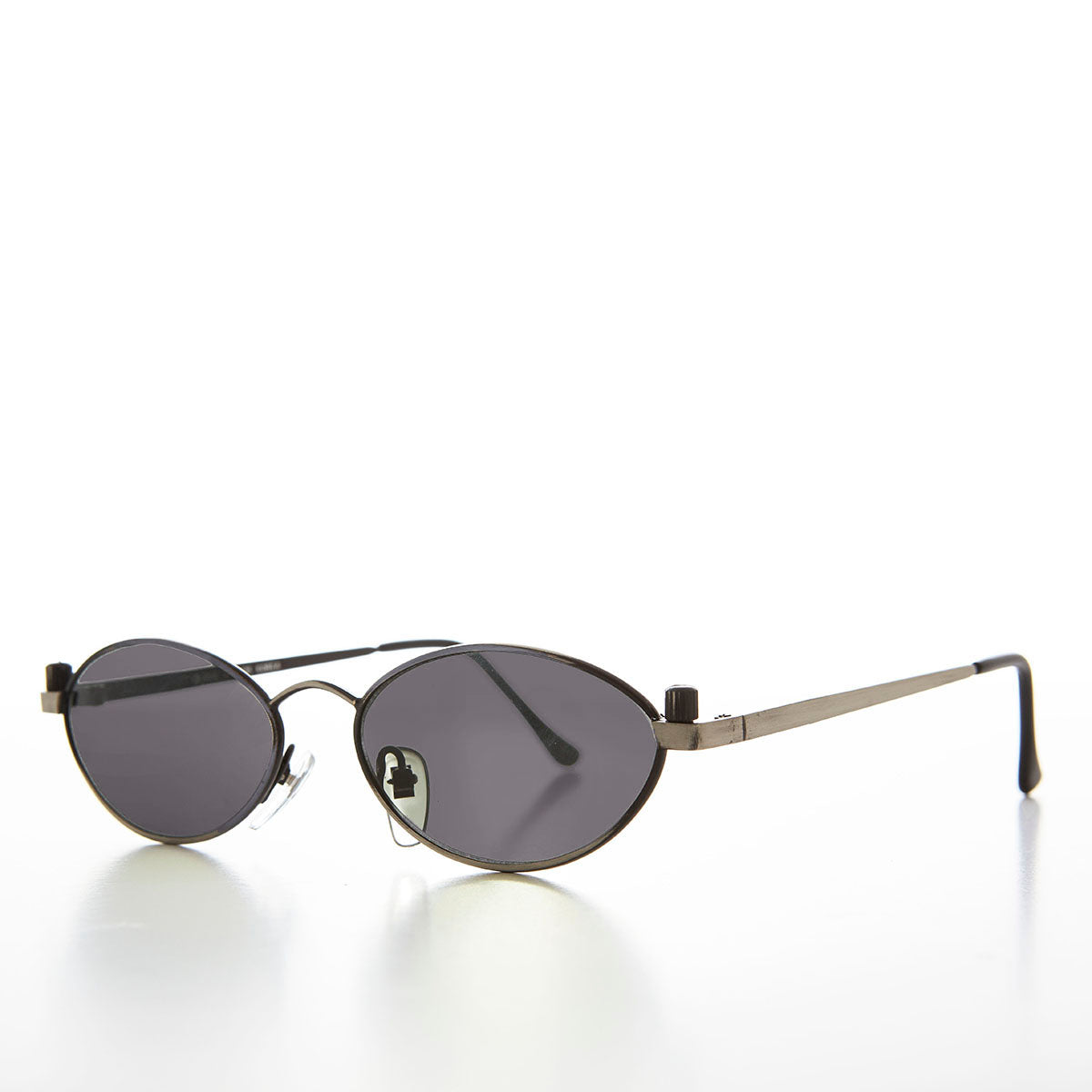 This great sunglass features a more unique, slimmer, oval shaped lens accented with a grip-screws. Make a bold statement in this one of a kind sunglass. Optical quality frame. New old stock. Never worn. Great condition. UV Protection.