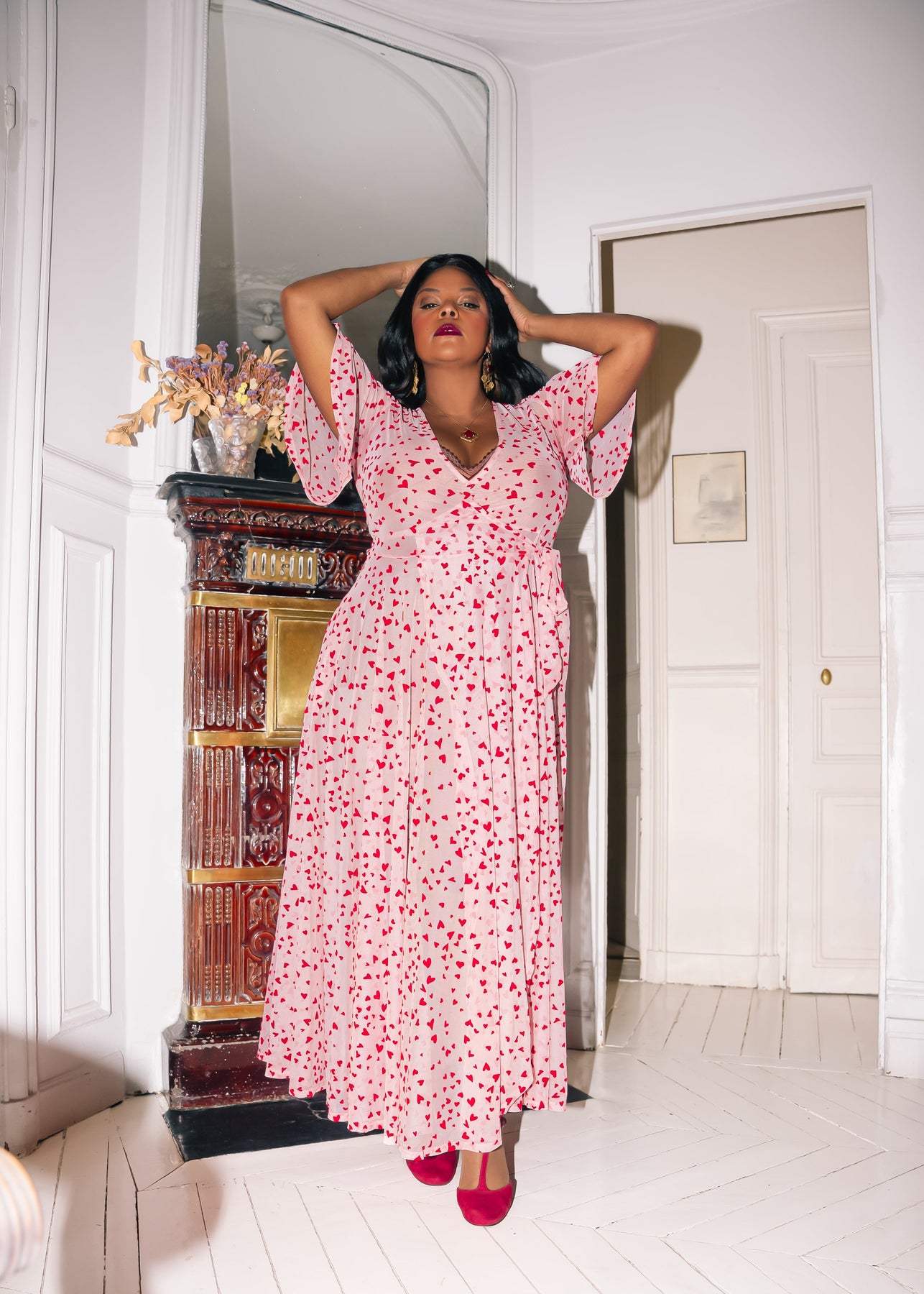 We couldn’t resist this dreamy, peachy-pink mesh with adorable flocked red hearts! Put it on and you’ll feel like you’re floating on a cloud. The Lydia is a true wrap style, with ample stretch that ensures a perfect fit. And of course - it has pockets!! It’s perfect for a date night, Galentines party, or if you want to lounge around the house looking glamorous!