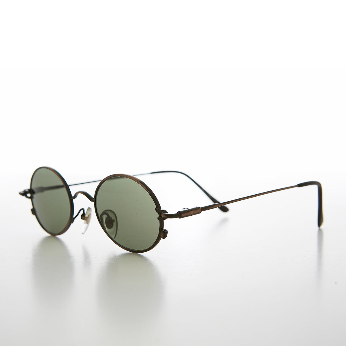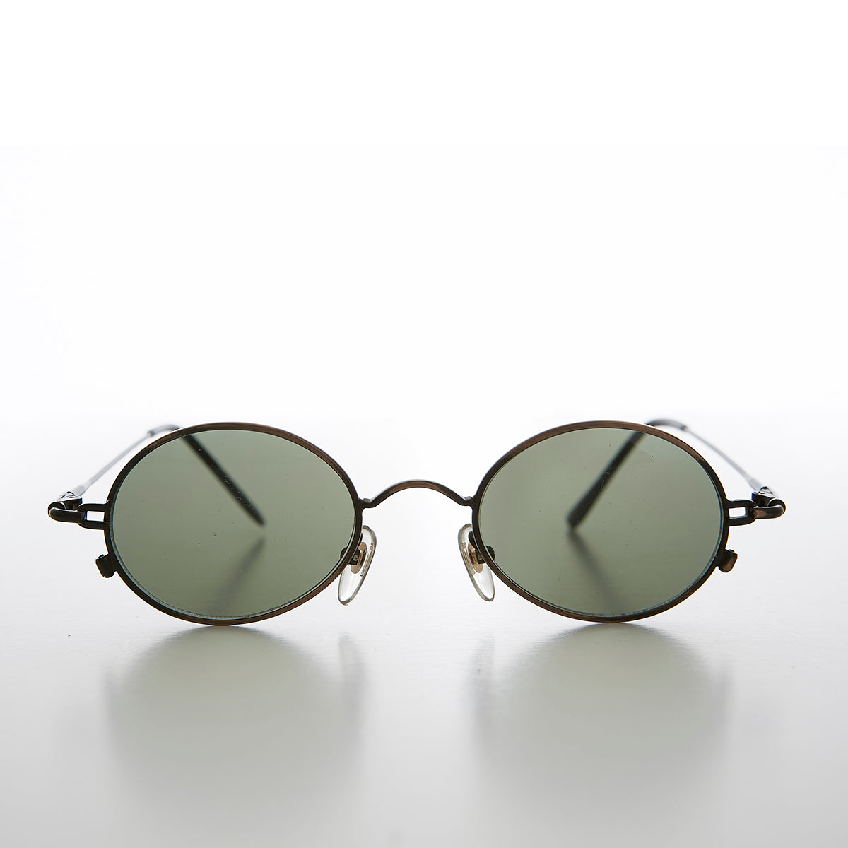 For the less obvious take on steampunk, this vintage 90s sunglass features a metal, oval, spectacle style frame. Please note, outside screws not only make a great industrial, sci-fi touch to this sleek sunglass but also enable lens removal. This frame is optical quality. New old stock. Never worn. Great condition. UV Protection.