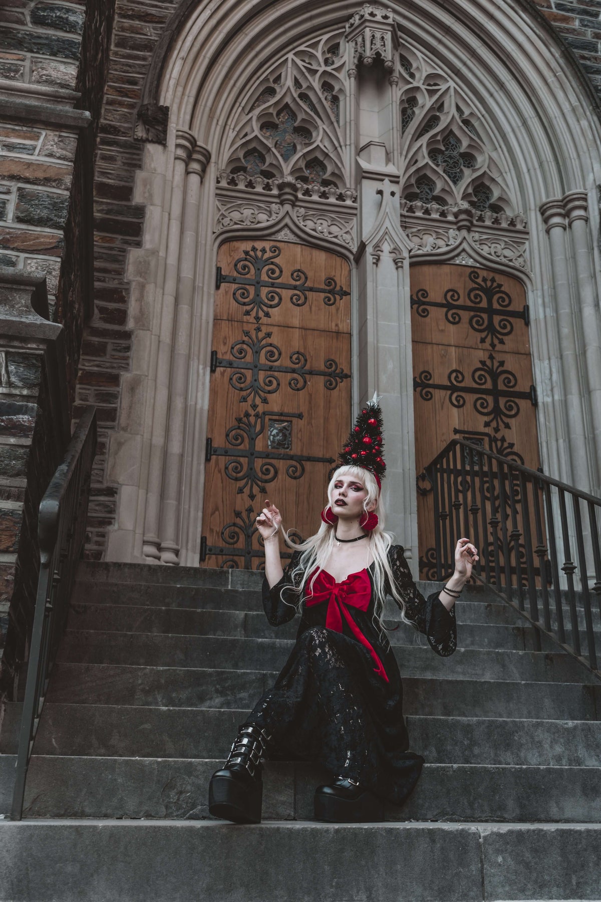 We HAD to bring the drama for the holidays with the new Priscilla Maxi! This gorgeous black dress features as black lace shell with bell sleeves and an empire waist, half lining, and interchangeable black and red velvet bows!