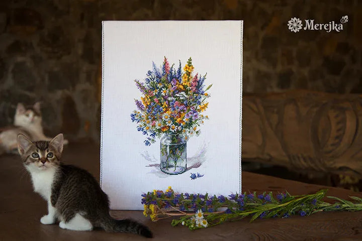 Kit contains: Canvas Zweigart Aida 16, white, DMC threads 34 colors, John James needles. The schema has colour symbols. There are two versions of schema with and without backstitches in each kit. Dimension 29x30 cm / 11,42x11,81 inches