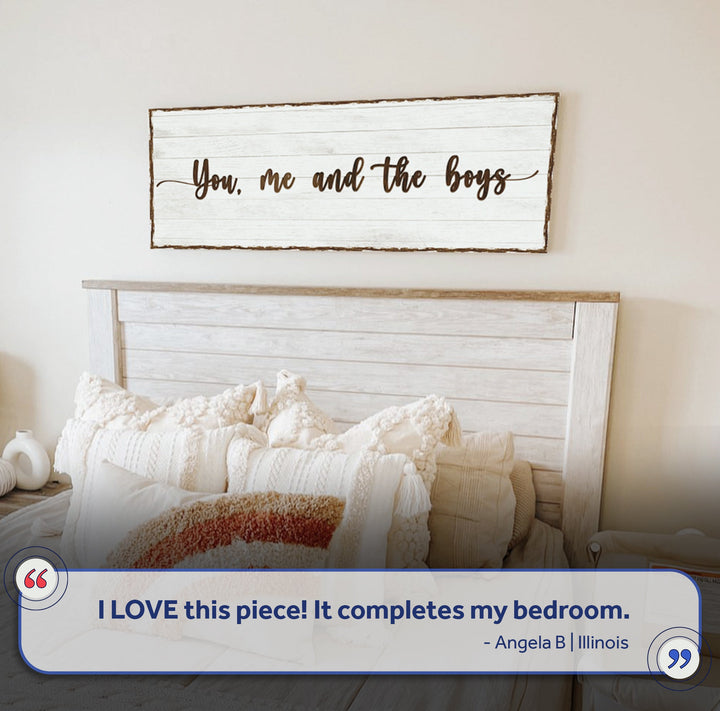 The printed design of this You, Me, And The Boys wall art is printed using UV-resistant ink on a thick premium canvas. The You, Me, And The Boys canvas wall art is ideal for creating an artistic ambiance in your living room or dining room area. Visit our collection choices of You, Me, And The Boys sign right now to pick the one that best suits you and your home.