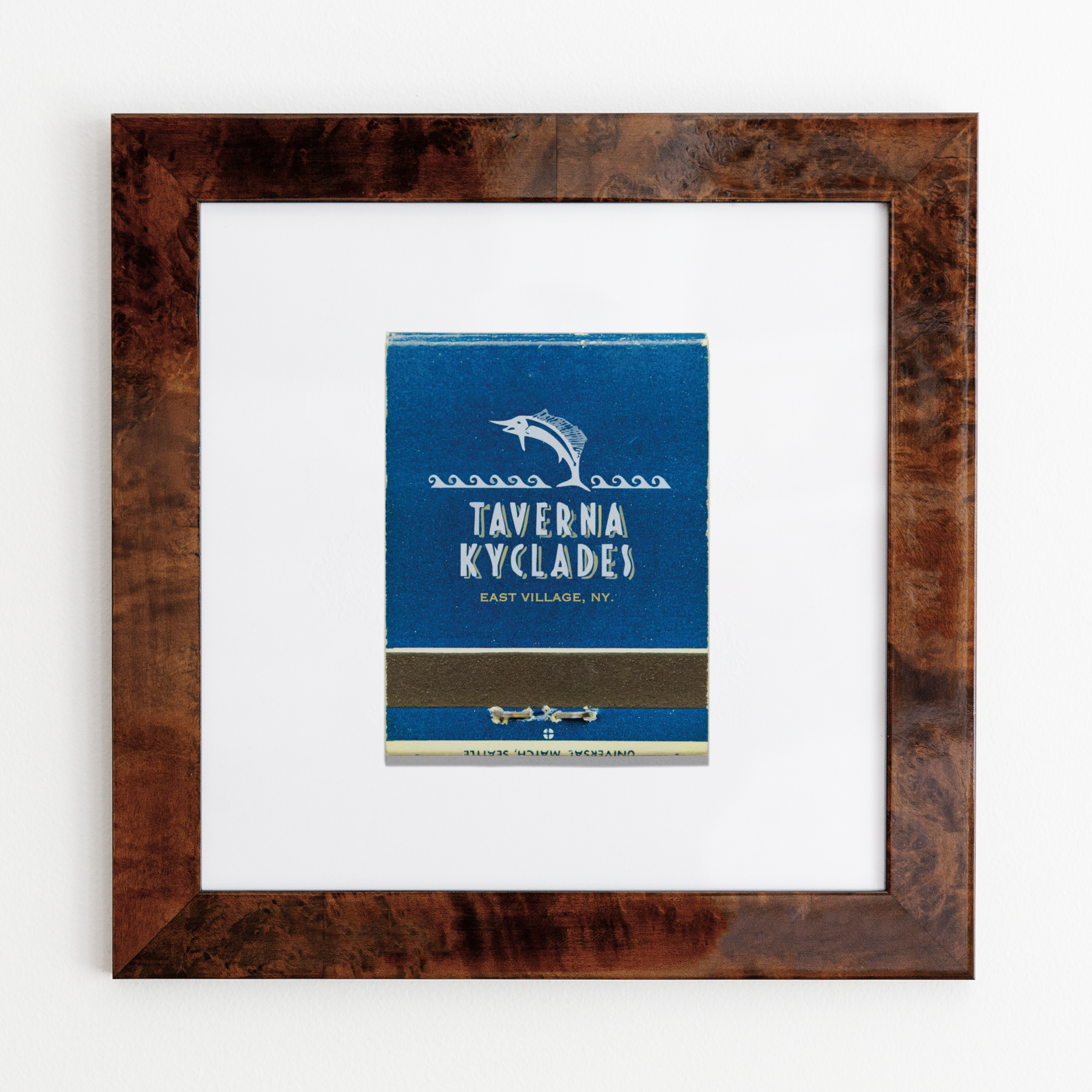 The Taverna Kyclades print showcases an iconic matchbook design.
