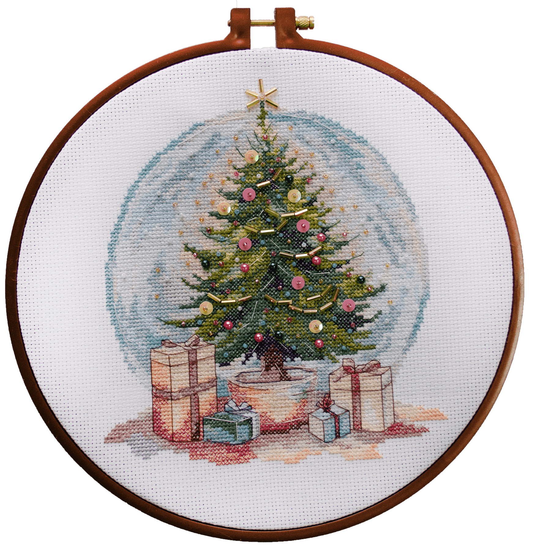 The set is completed with canvas 270*290 mm white color count 14, threads 45 m. In addition, the set is completed with PRECIOSA beads #10 and a needle for embroidery with beads, decorative glass stones - pearls of 2 colors - 11 pcs., Glass beads - 29 pcs., sequins - 2 colors - 14 pcs.