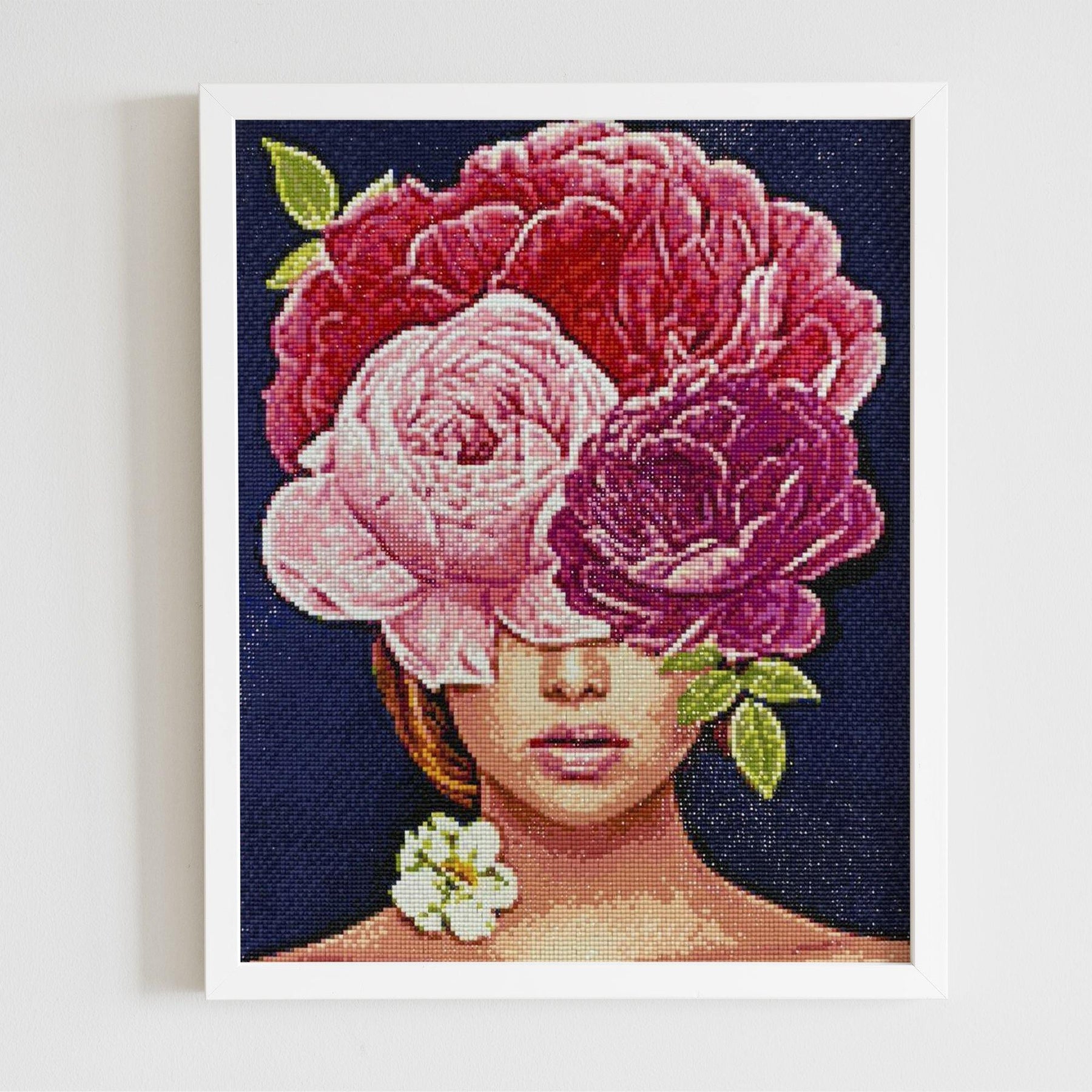 The diamond painting kit Crafting Spark contains: high quality self-adhesive canvas with printed detailed design chart; tweezers, stylus, dry glue pad and two craft trays; reusable zip lock bags with pre-sorted square acrylic diamonds in extra quantity.