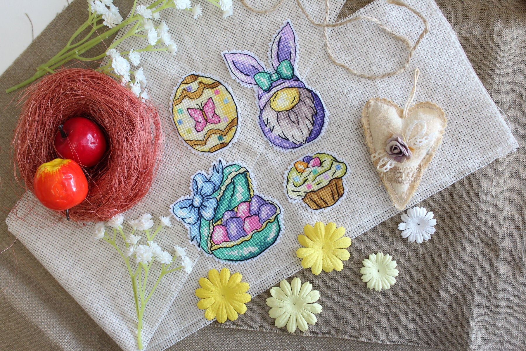Cute Easter composition consisting with bunny, Easter eggs, pastry and basket with baby. Kit makes 4 one sided figures stitched, added with white felt in the back and magnet. You can keep these figures on the fridge and bring some  spring freshness and fun into your interior.