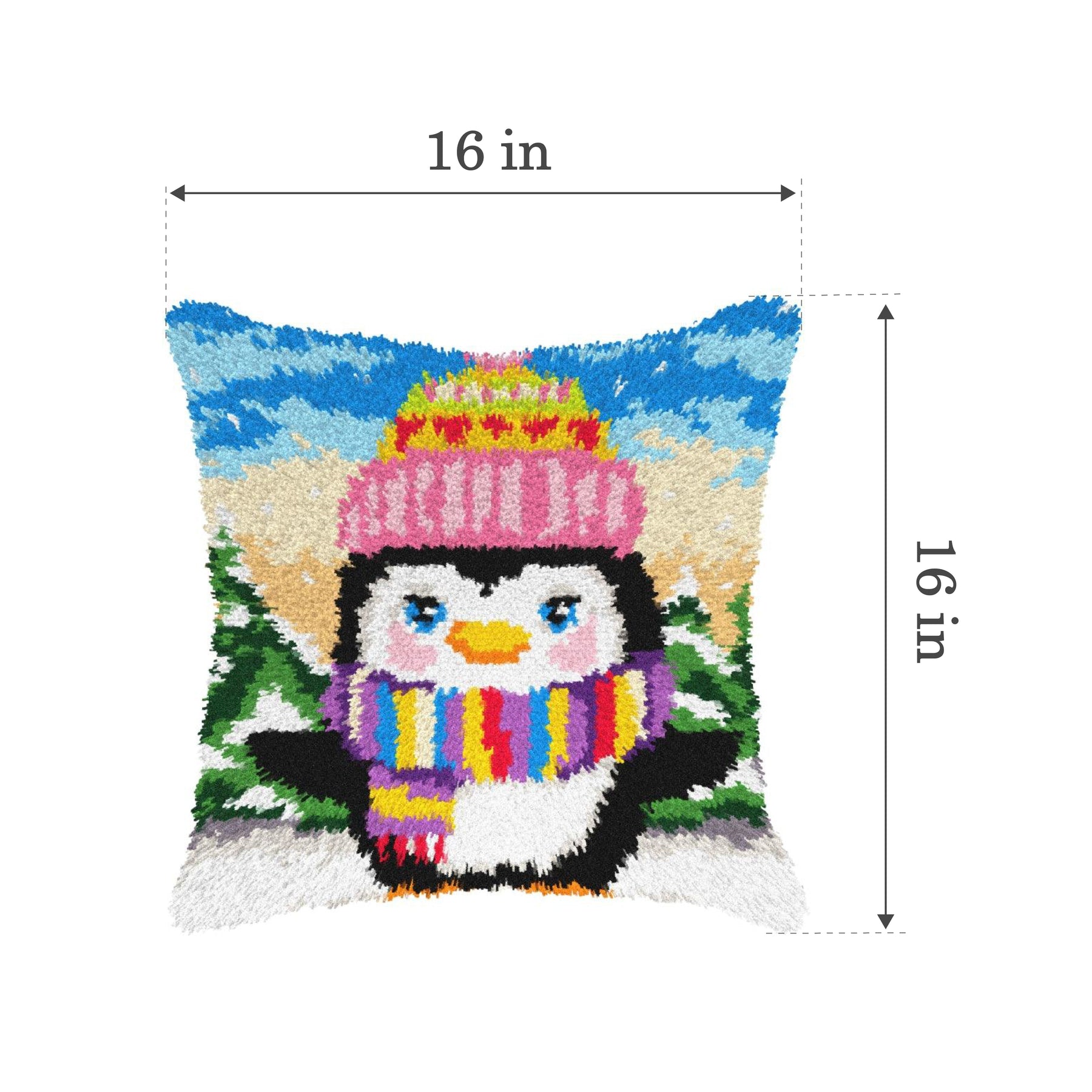 Kit contains: printed canvas Zweigart, 100% acrylic pre-cut yarn packs 18 colors, chart/instruction, latch-hook tool. Dimensions 40x40 cm/16x16 inches, 50% cotton/50%polyester fabric, 100% acrylic yarn, paper, metal/plastic. Make your own fluffy, shaggy cushion with cute, Christmas design. Only high quality materials inside - pattern perfectly printed on Zweigart canvas, chunky acrylic yarn in bundles for your comfort and convenience as well as latch hook tool.
