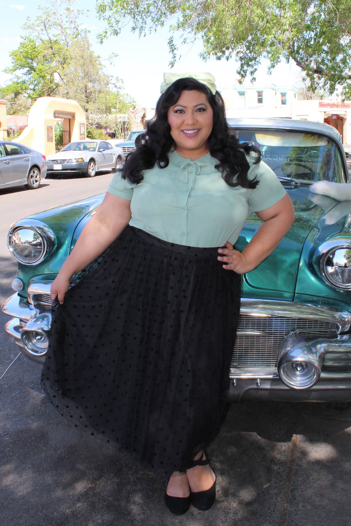 - Pleated collar with bow detail